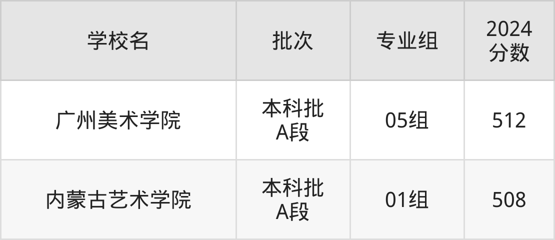 考生能上的有2所,全部在本科批次录取。具体有:广州美术学院05组(512分)、内蒙古艺术学院01组(508分)。