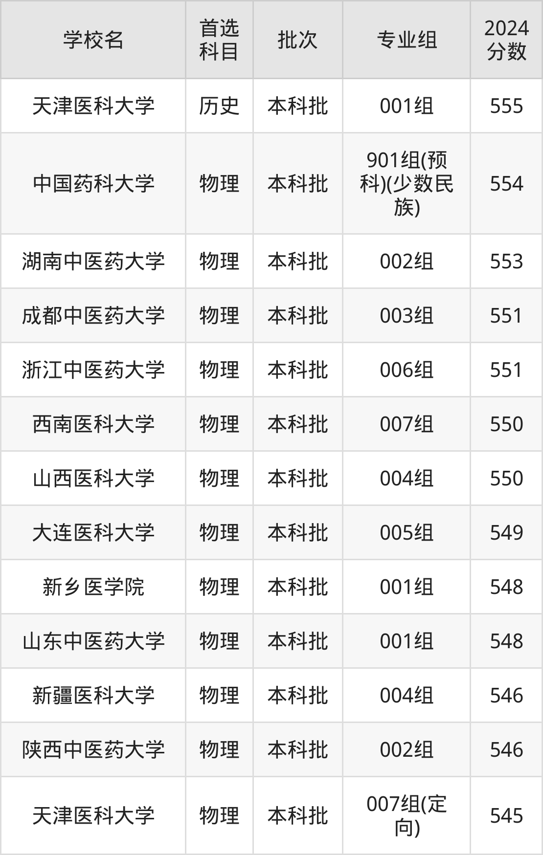 为给各位考生更加详细的参考,下文整理了2024年录取分数线在545分到555分之间的医药类大学名单汇总。
