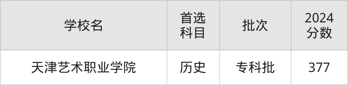首选历史科目考生能上的有1所,全部在专科批次录取。具体有:天津艺术职业学院(377分)。