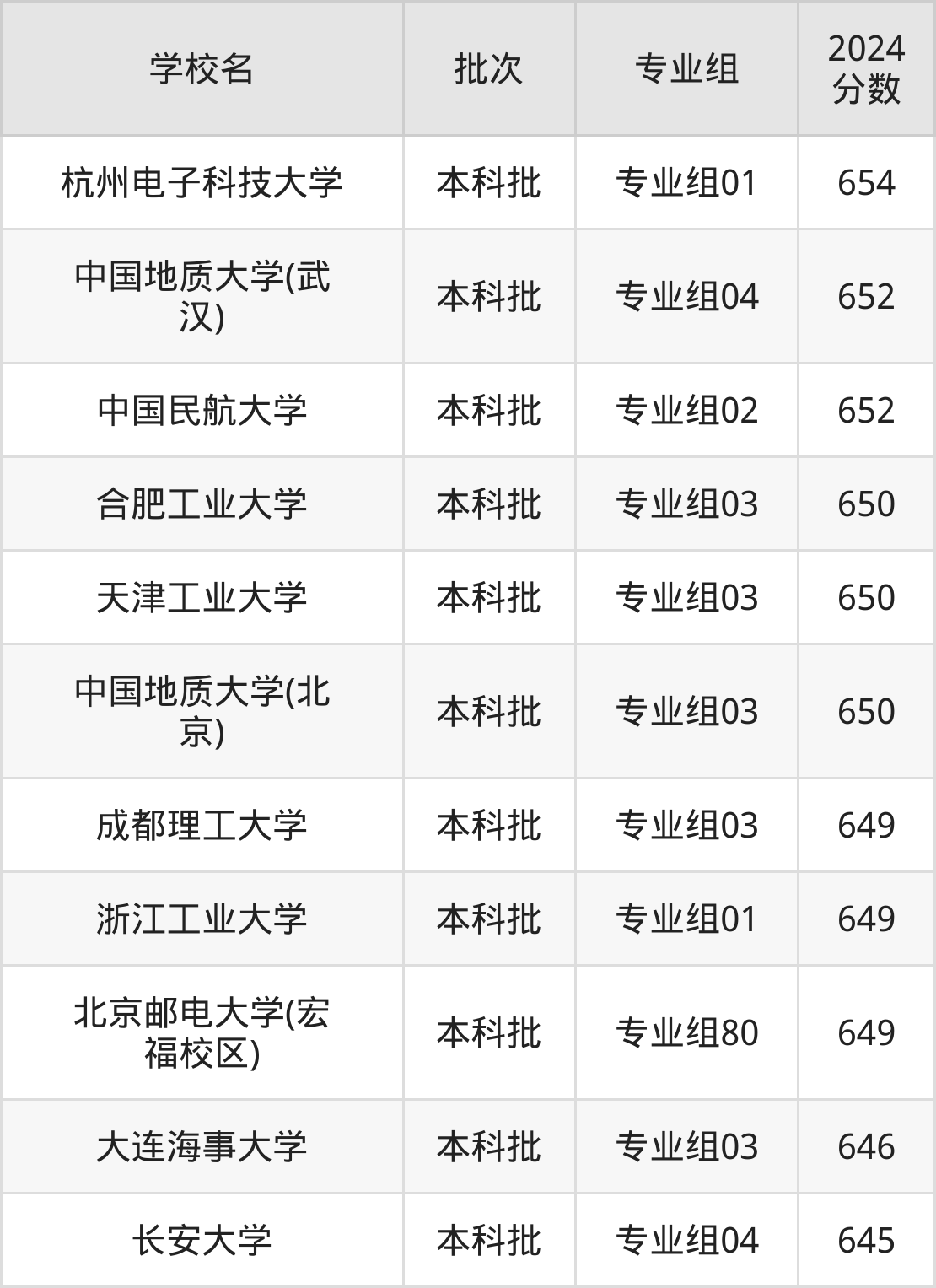 考生能上的有11所,全部在本科批次录取。具体有:杭州电子科技大学专业组01(654分)、中国地质大学(武汉)专业组04(652分)、中国民航大学专业组02(652分)、合肥工业大学专业组03(650分)等。