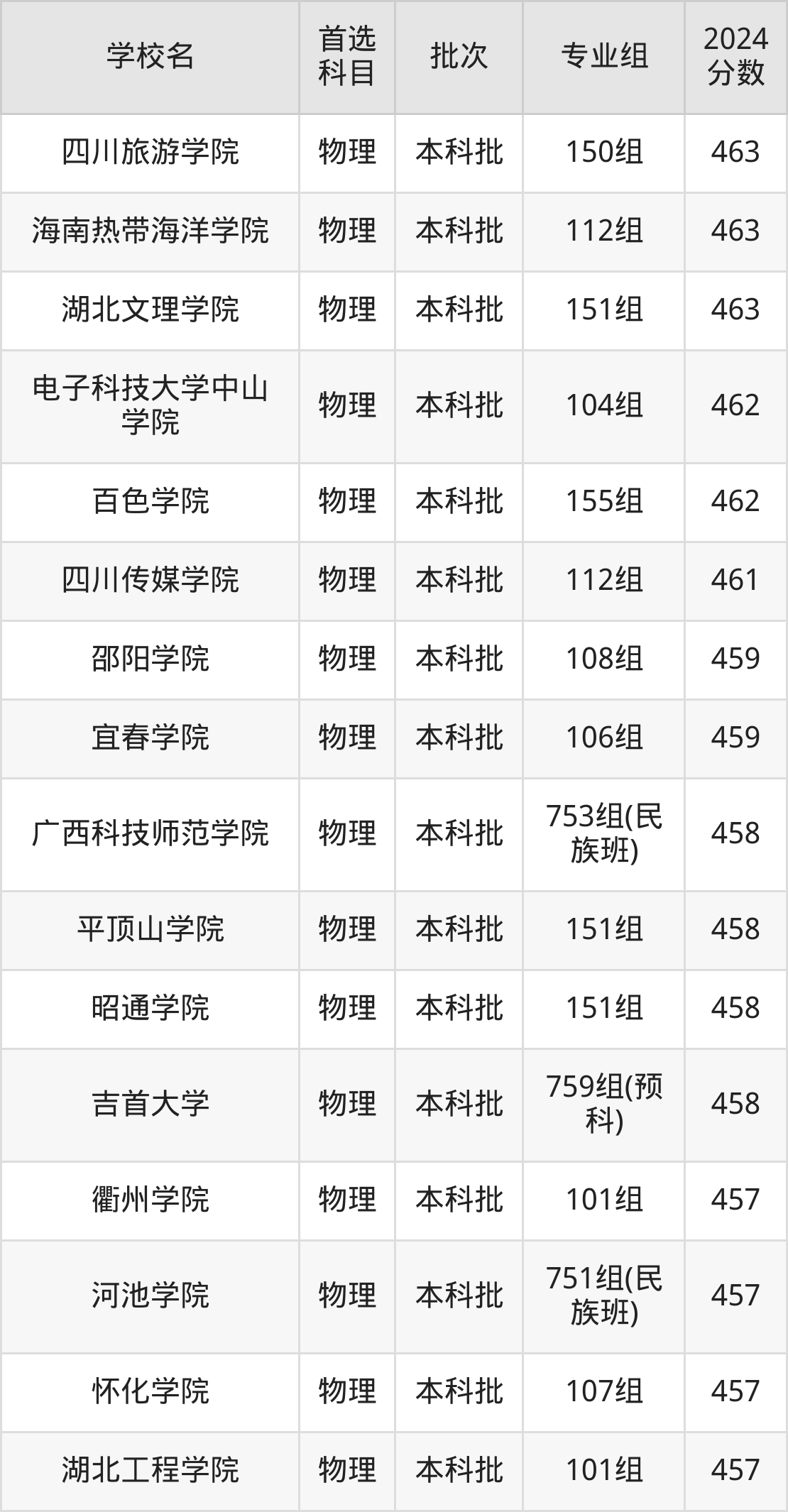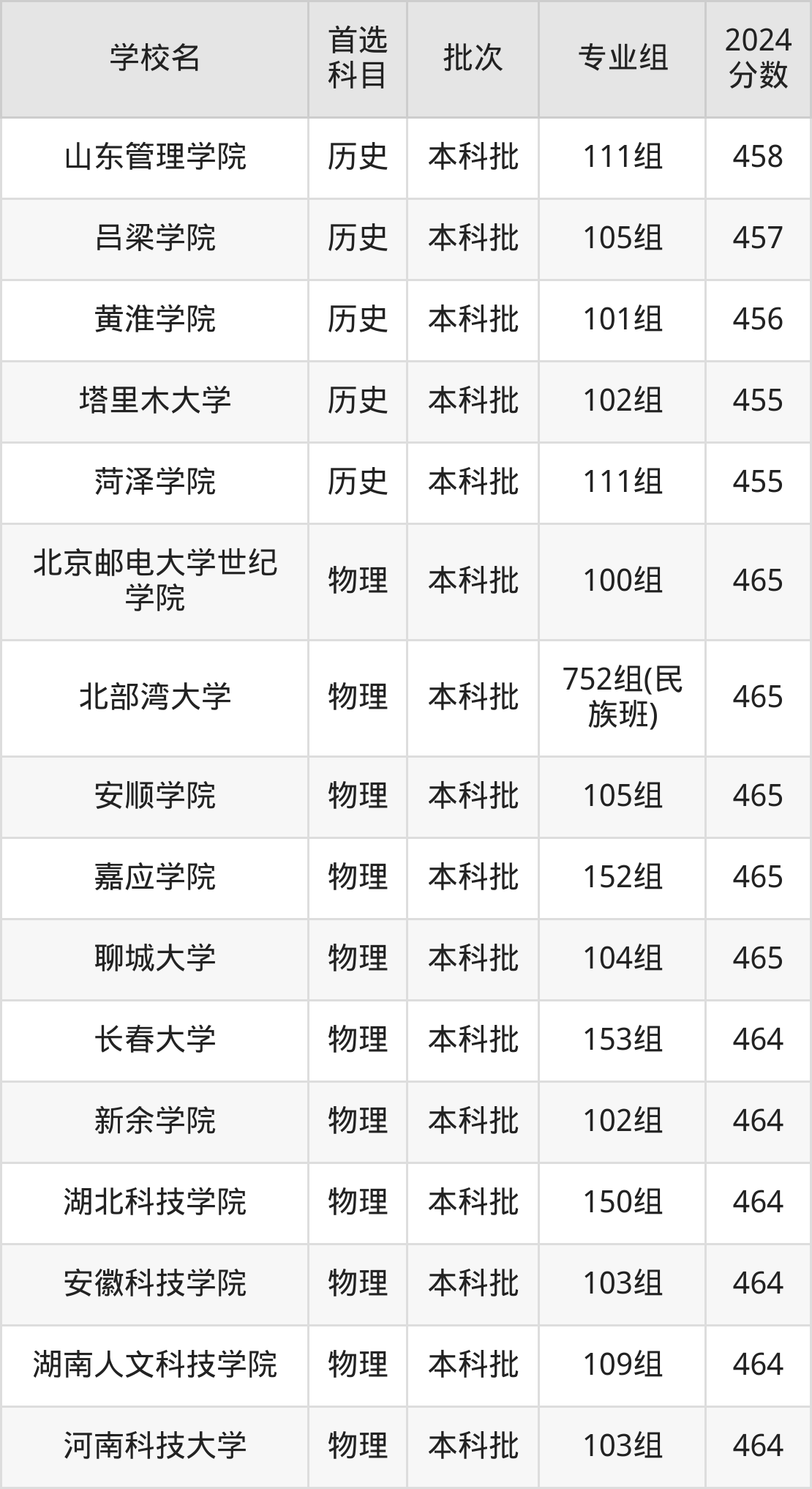 首选物理科目考生能上的有31所,全部在本科批次录取。具体有:北京邮电大学世纪学院100组(465分)、北部湾大学752组(民族班)(465分)、安顺学院105组(465分)、嘉应学院152组(465分)等。
