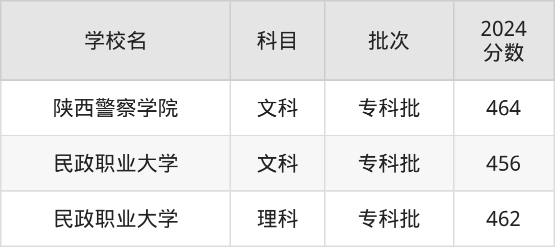 文科科目考生能上的有2所,全部在本科批次录取。具体有:陕西警察学院(464分)、民政职业大学(456分);