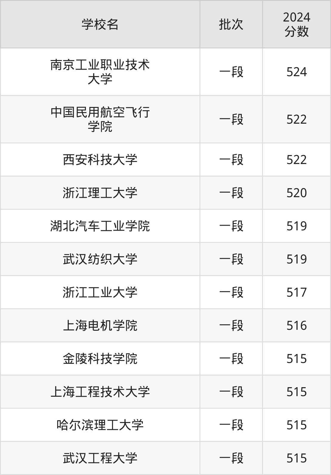 考生能上的有12所,全部在本科批次录取。具体有:南京工业职业技术大学(524分)、中国民用航空飞行学院(522分)、西安科技大学(522分)、浙江理工大学(520分)等。