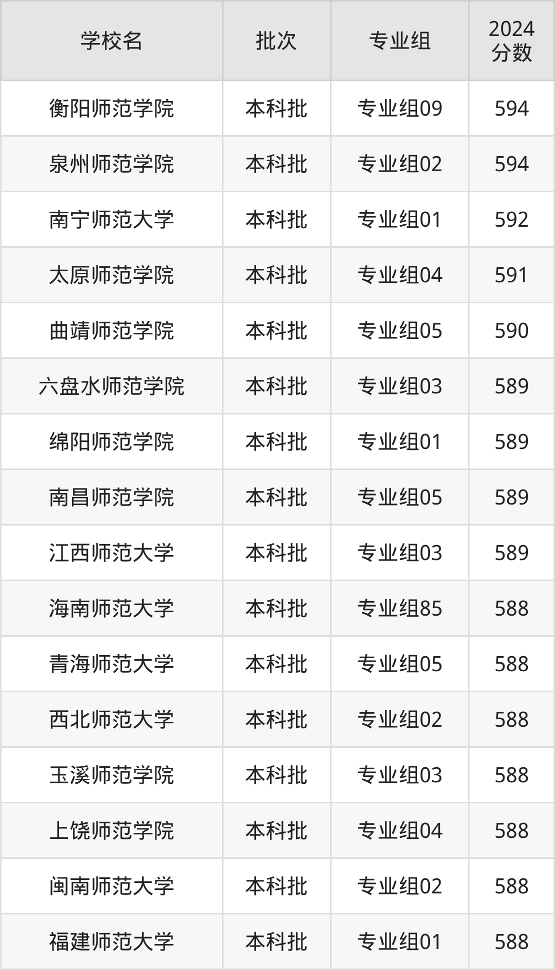 为给各位考生更加详细的参考,下文整理了2024年录取分数线在585分到595分之间的师范类大学名单汇总。