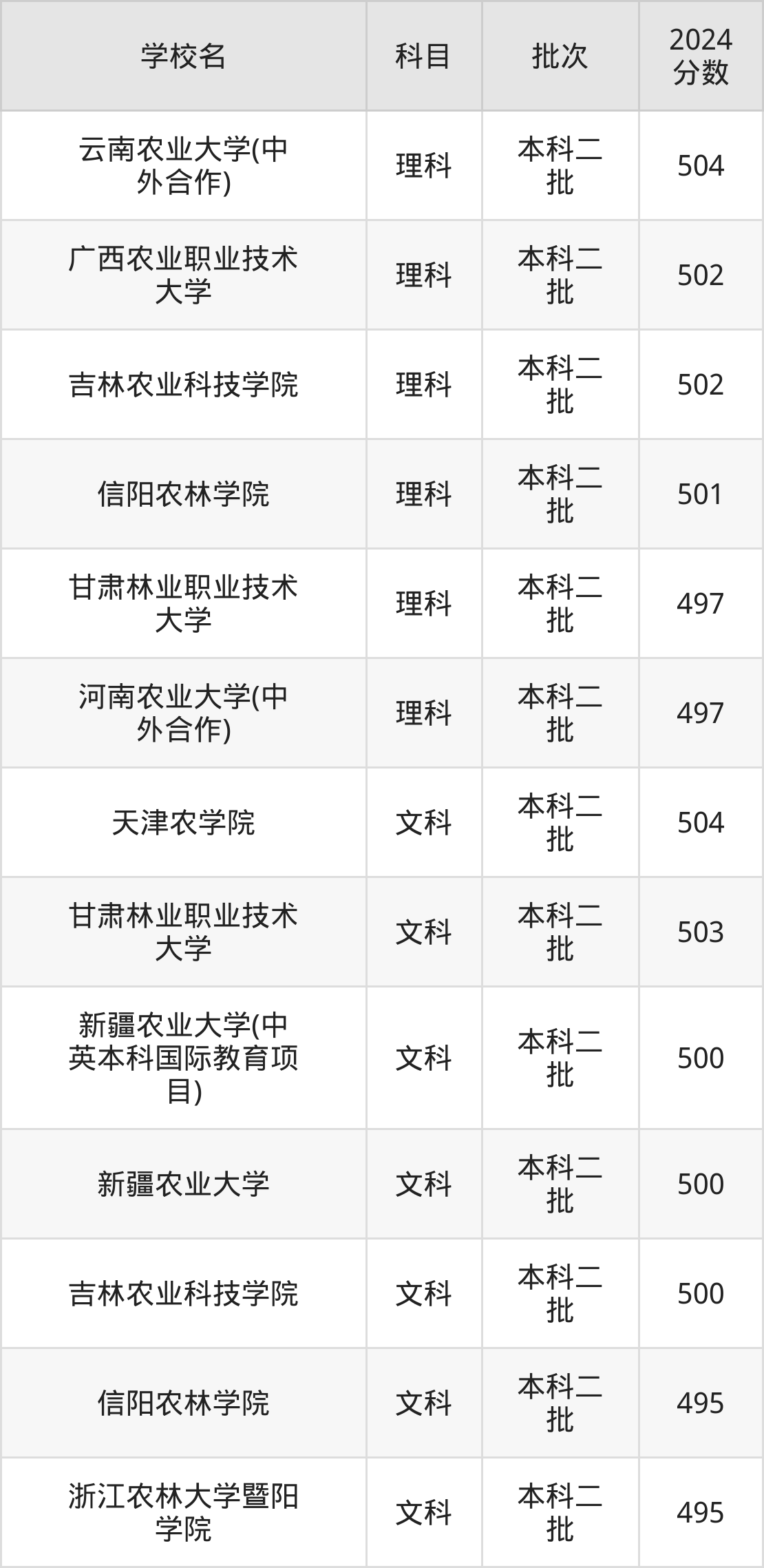 理科科目考生能上的有6所,全部在本科批次录取。具体有:云南农业大学(中外合作)(504分)、广西农业职业技术大学(502分)、吉林农业科技学院(502分)、信阳农林学院(501分)等;