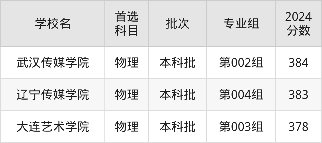 首选物理科目考生能上的有3所,全部在本科批次录取。具体有:武汉传媒学院第002组(384分)、辽宁传媒学院第004组(383分)、大连艺术学院第003组(378分)。