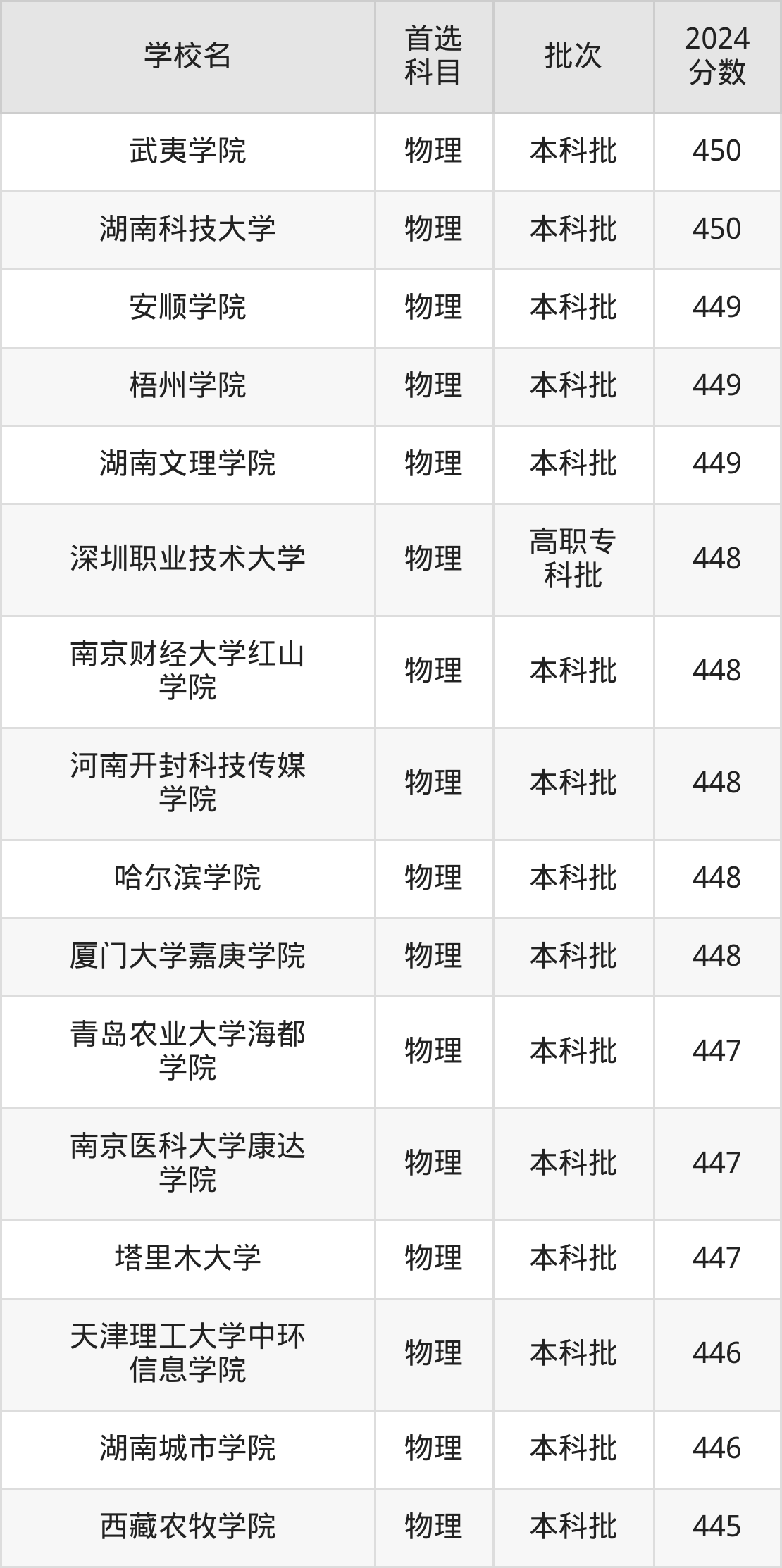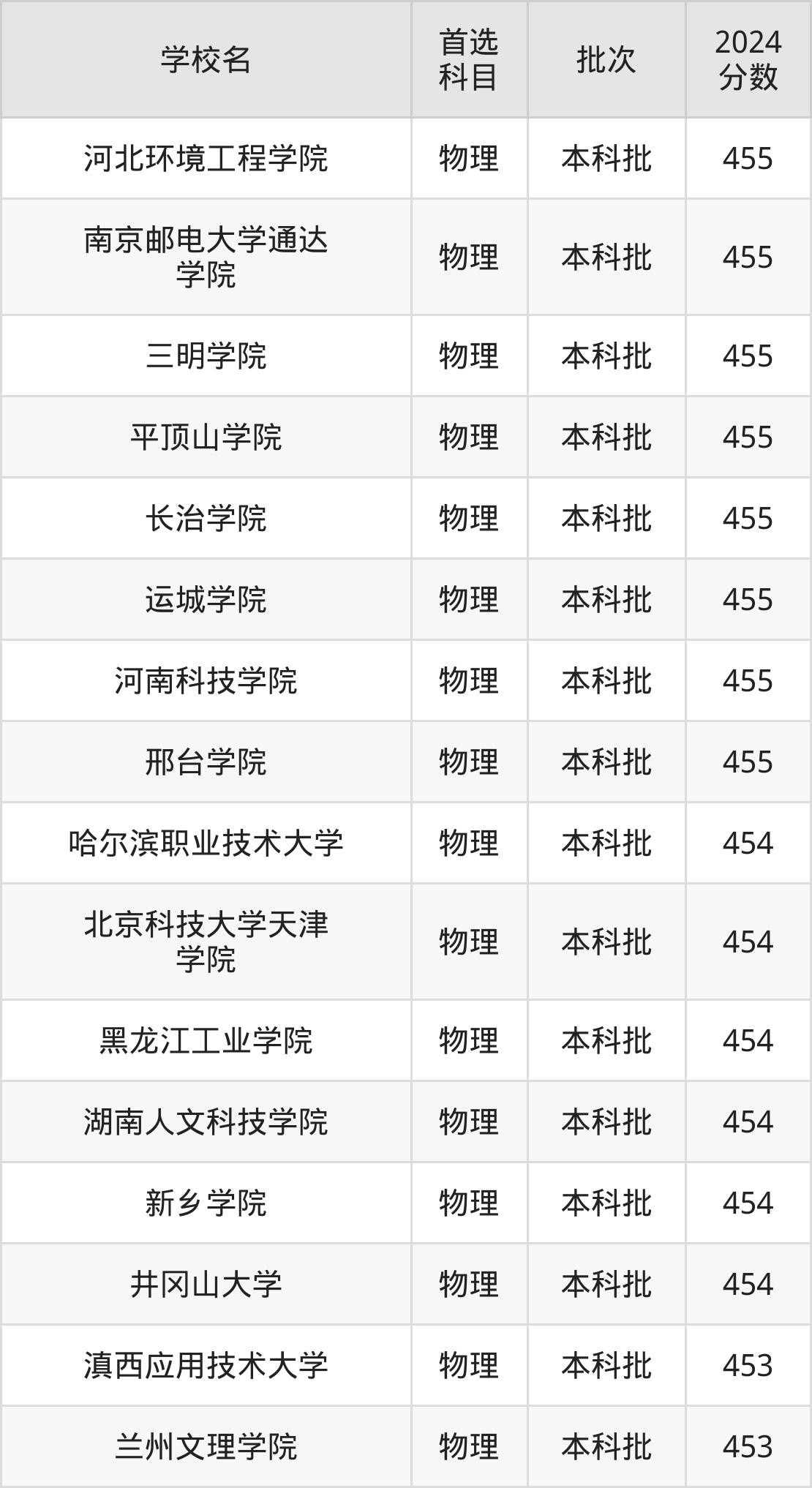 首选物理科目考生能上的有50所,全部在本科批次录取。具体有:河北环境工程学院(455分)、南京邮电大学通达学院(455分)、三明学院(455分)、平顶山学院(455分)等;