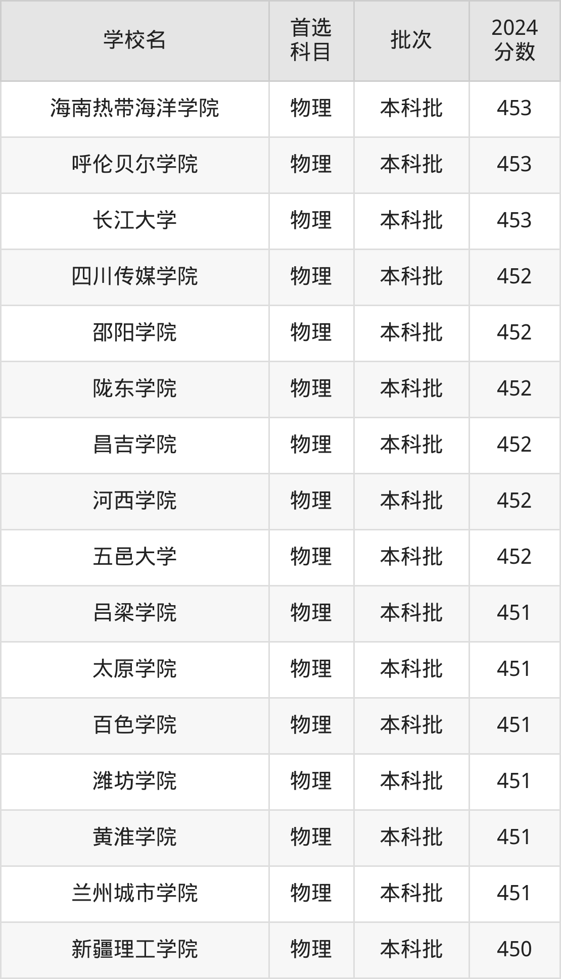 根据2024年高考招录数据,录取分数线刚好为450分的综合类大学有兰州文理学院、新疆理工学院、长治学院。下面是这些学校的相关介绍: