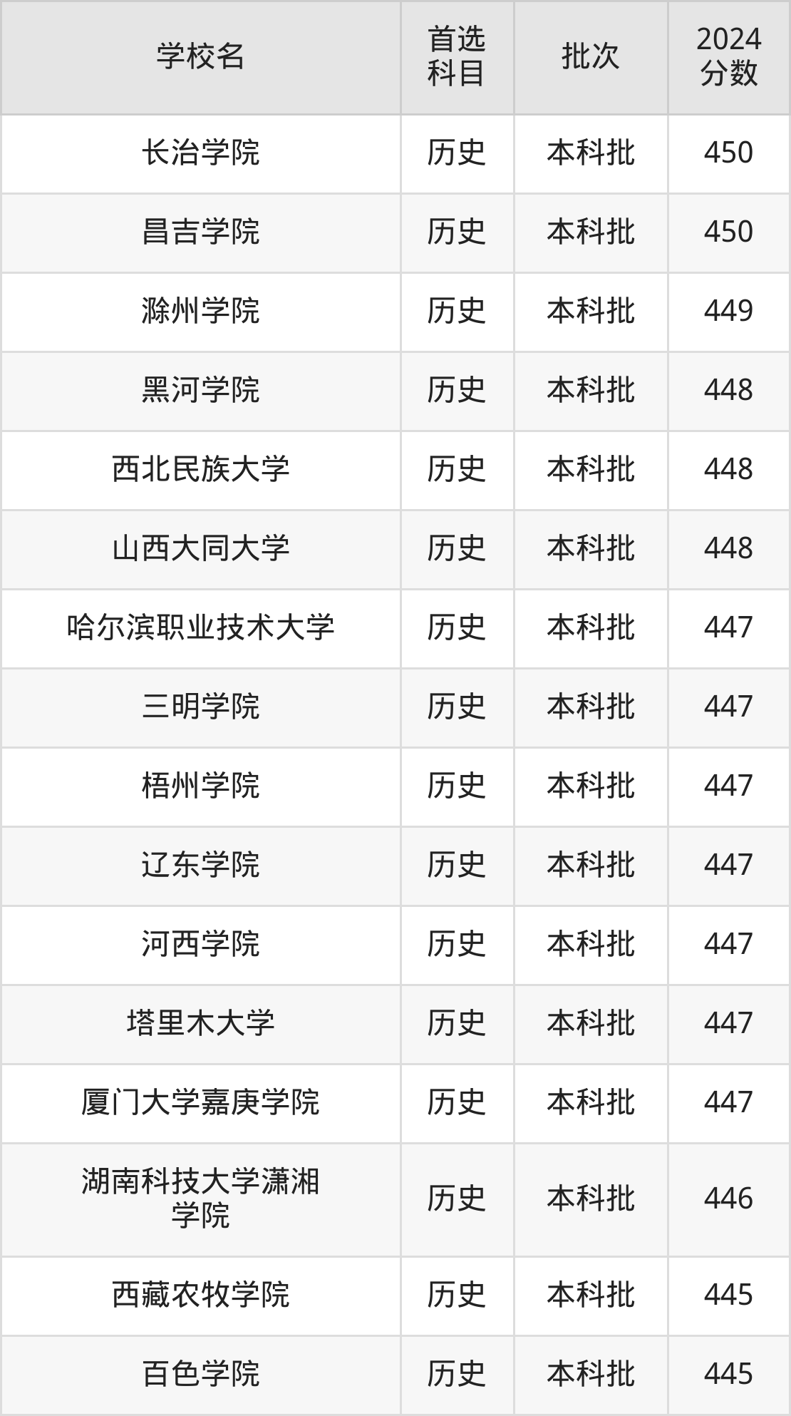 首选历史科目考生能上的有30所,全部在本科批次录取。具体有:黑龙江工业学院(455分)、山东管理学院(454分)、西昌学院(454分)、新乡学院(454分)等。