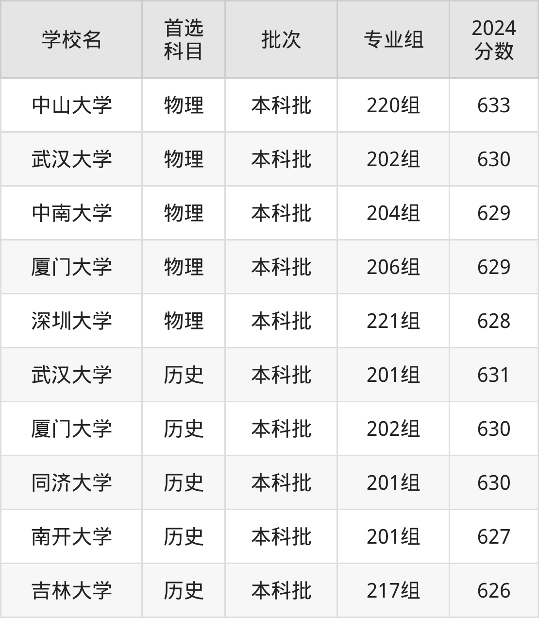 首选物理科目考生能上的有5所,全部在本科批次录取。具体有:中山大学220组(633分)、武汉大学202组(630分)、中南大学204组(629分)、厦门大学206组(629分)等;