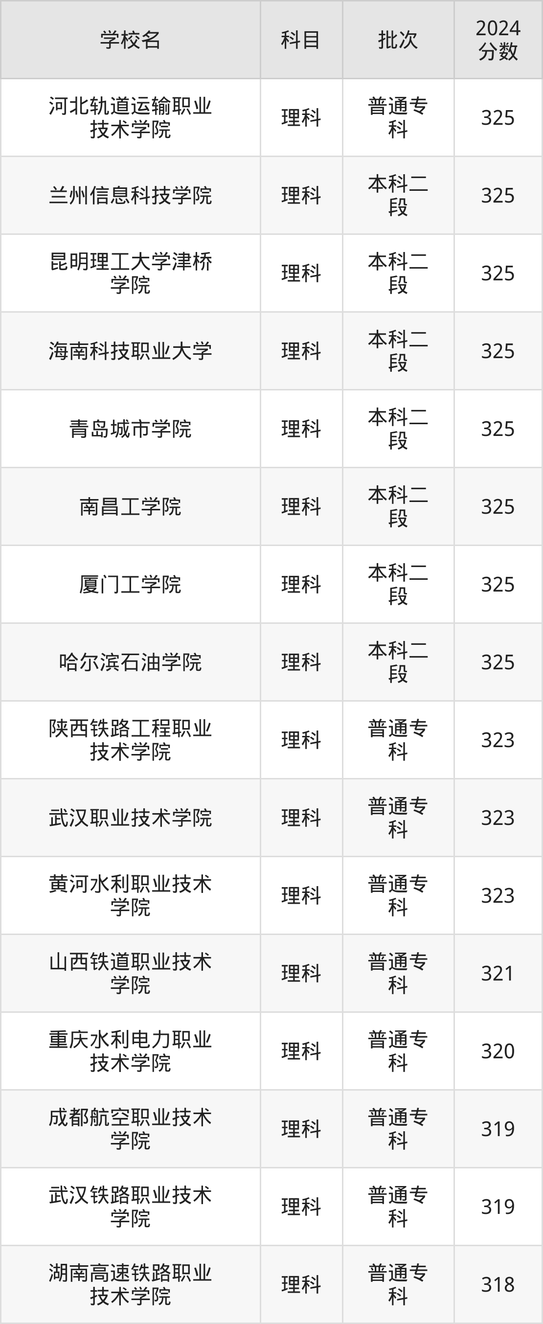 理科科目考生能上的有27所,包括10所本科医科大学和17所专科医科大学。具体有:河北轨道运输职业技术学院(325分)、兰州信息科技学院(325分)、昆明理工大学津桥学院(325分)、海南科技职业大学(325分)等;