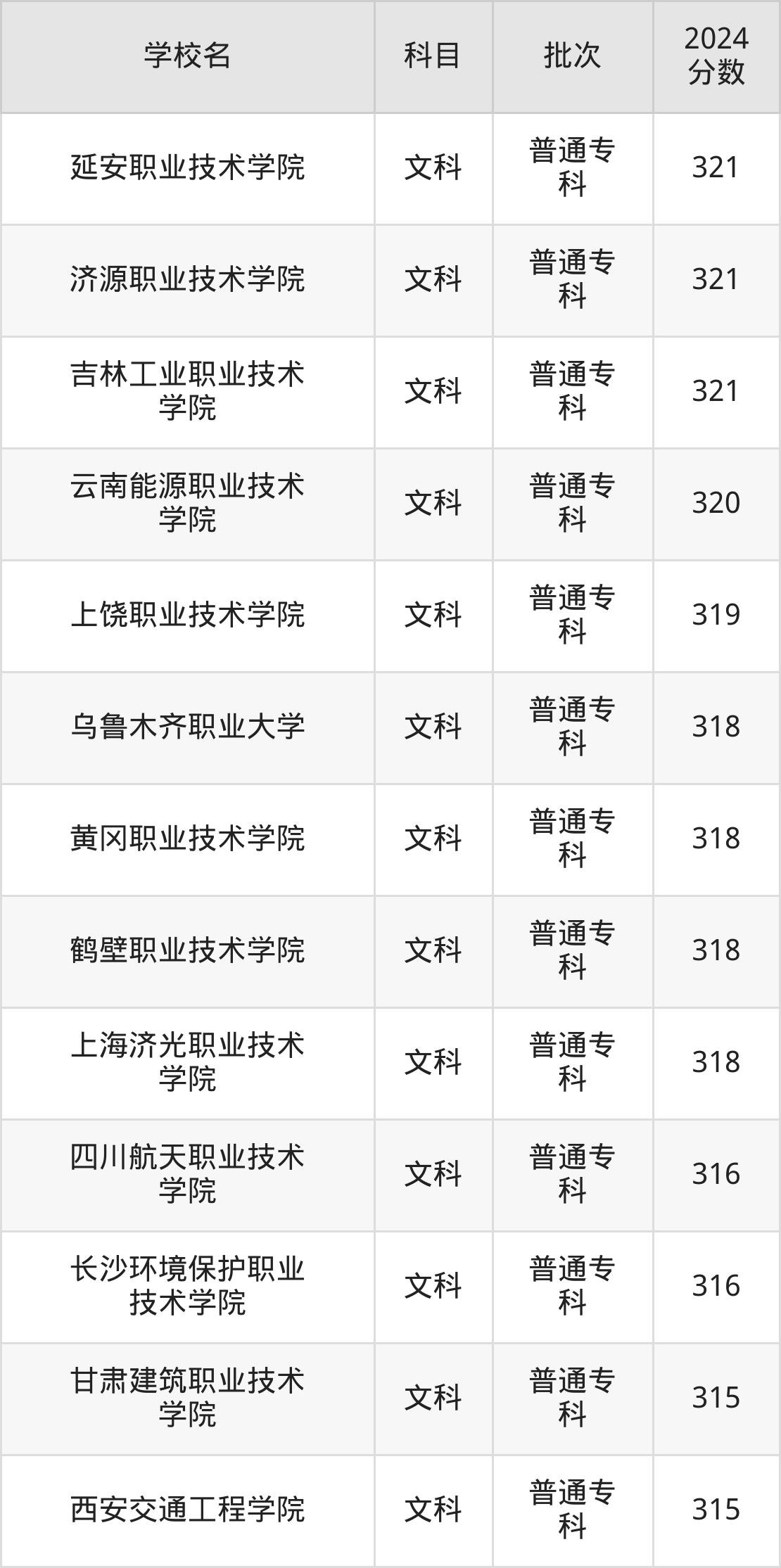 文科科目考生能上的有18所,包括1所本科医科大学和17所专科医科大学。具体有:湖南交通职业技术学院(325分)、福建水利电力职业技术学院(324分)、陕西航空职业技术学院(323分)、广元中核职业技术学院(323分)等。