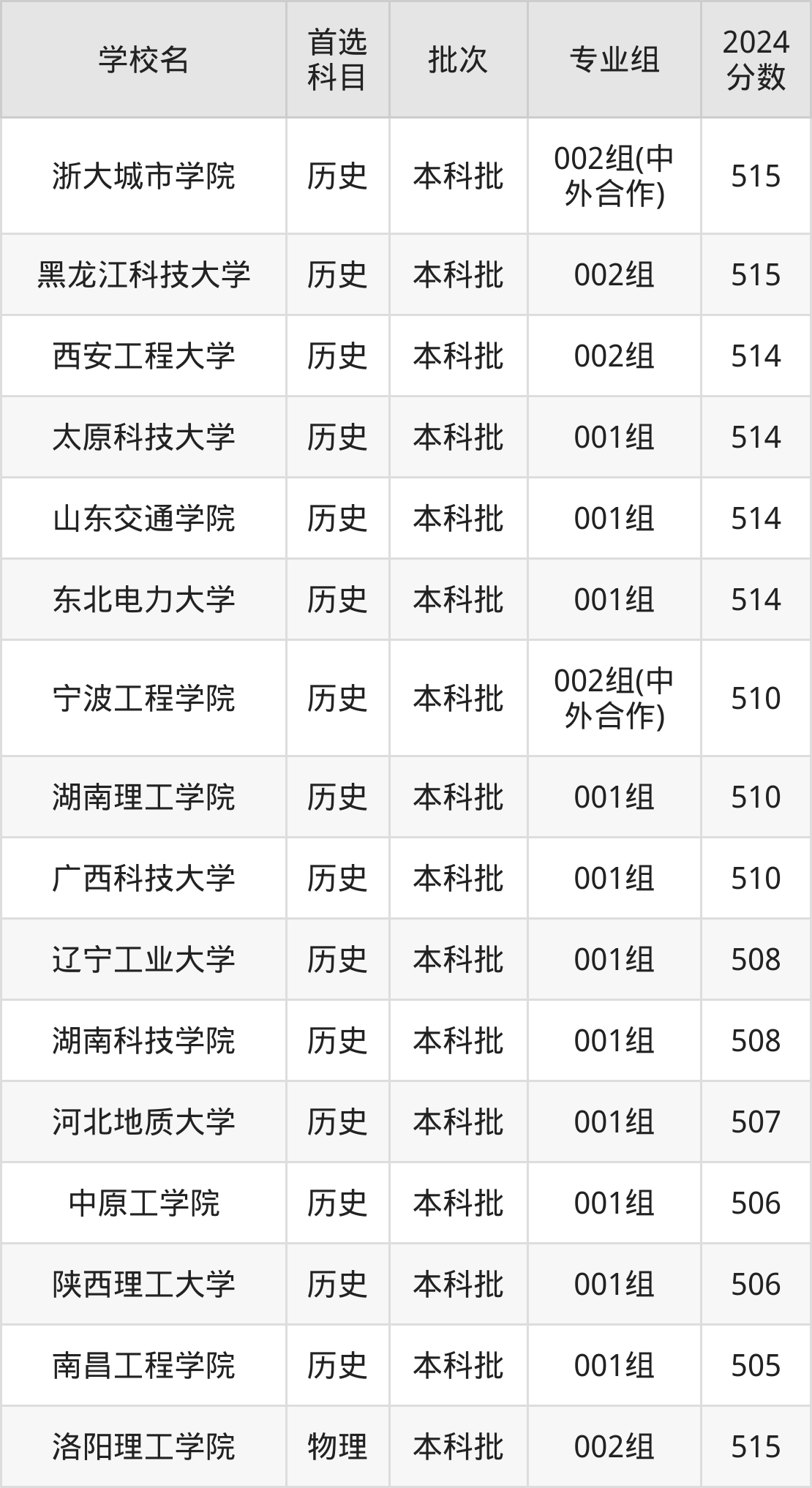首选历史科目考生能上的有15所,全部在本科批次录取。具体有:浙大城市学院002组(中外合作)(515分)、黑龙江科技大学002组(515分)、西安工程大学002组(514分)、太原科技大学001组(514分)等;
