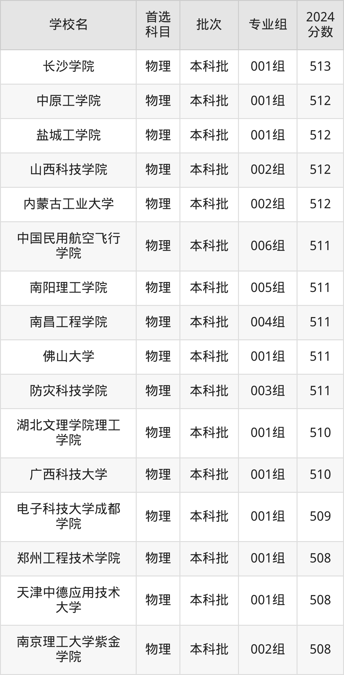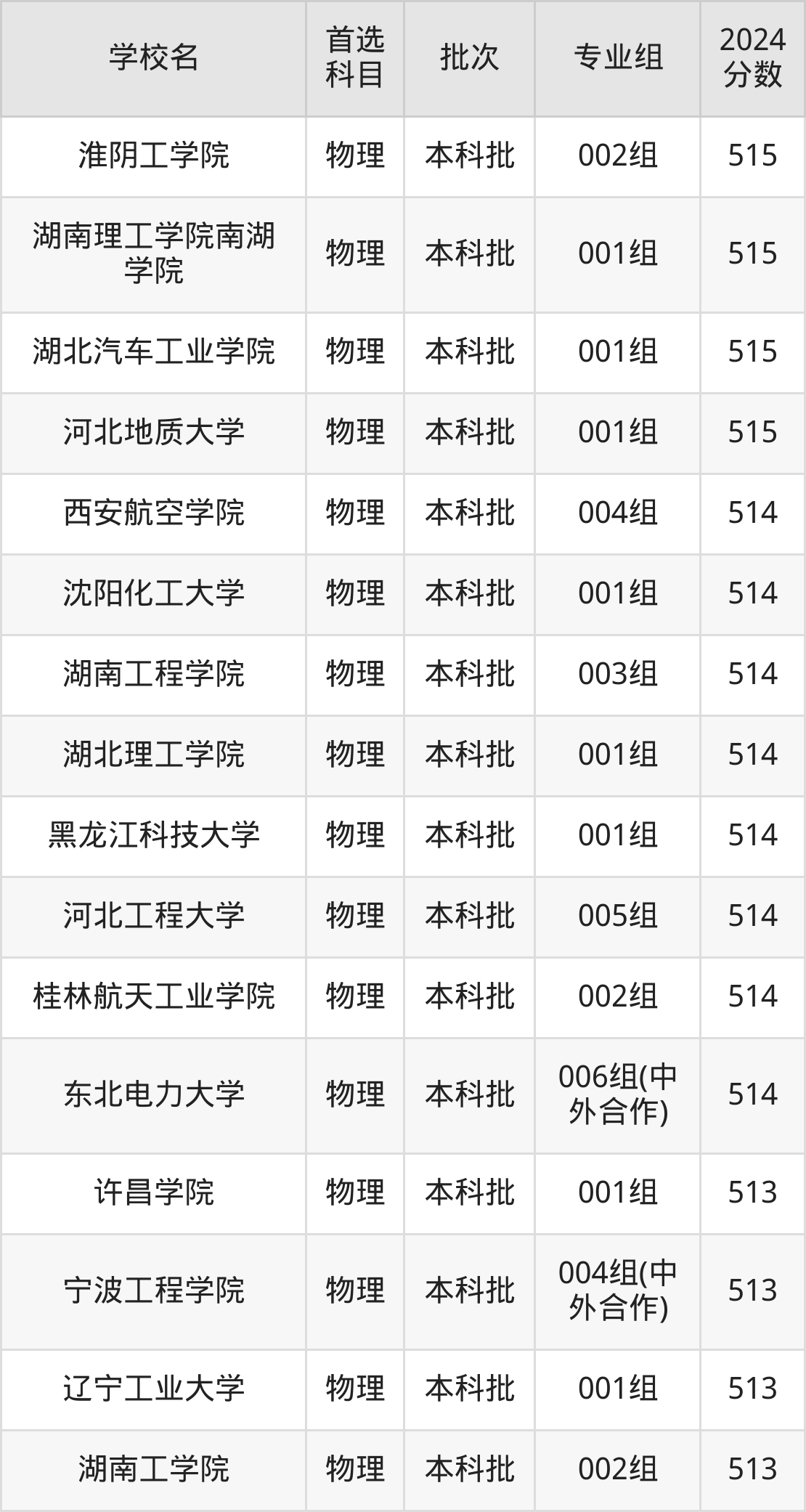 首选物理科目考生能上的有45所,全部在本科批次录取。具体有:洛阳理工学院002组(515分)、淮阴工学院002组(515分)、湖南理工学院南湖学院001组(515分)、湖北汽车工业学院001组(515分)等。