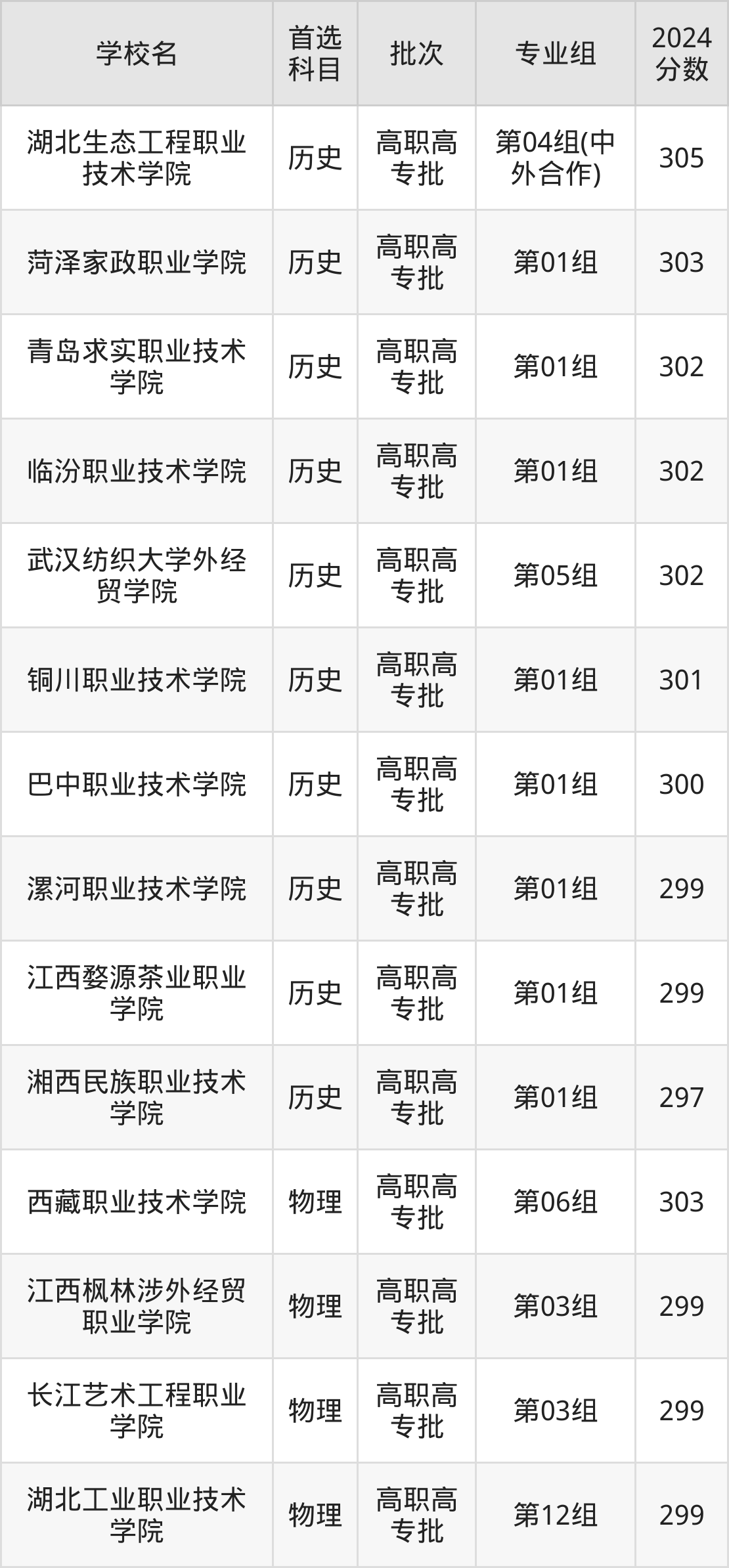 首选物理科目考生能上的有4所,全部在专科批次录取。具体有:西藏职业技术学院第06组(303分)、江西枫林涉外经贸职业学院第03组(299分)、长江艺术工程职业学院第03组(299分)、湖北工业职业技术学院第12组(299分)等。