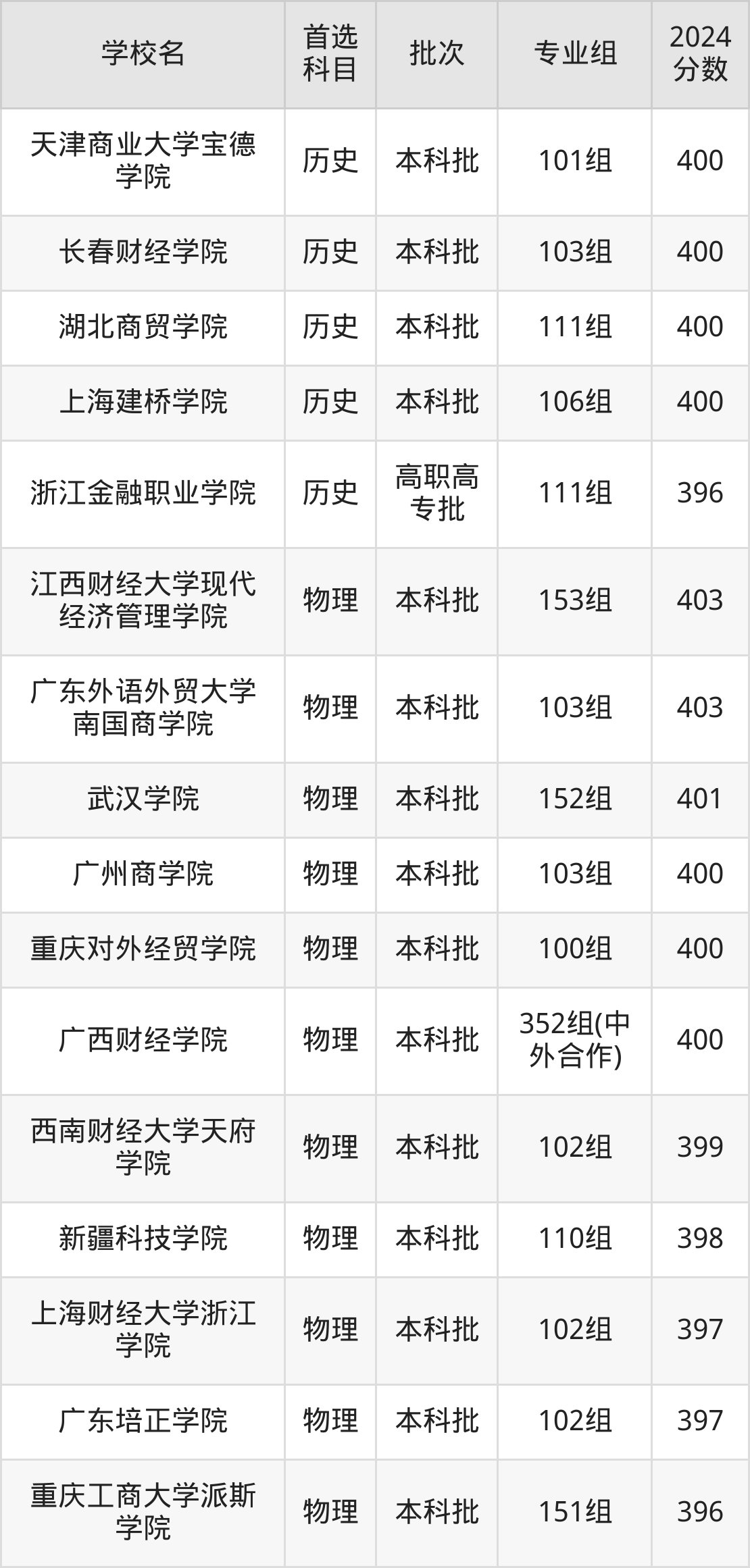 首选物理科目考生能上的有11所,全部在本科批次录取。具体有:江西财经大学现代经济管理学院153组(403分)、广东外语外贸大学南国商学院103组(403分)、武汉学院152组(401分)、广州商学院103组(400分)等。