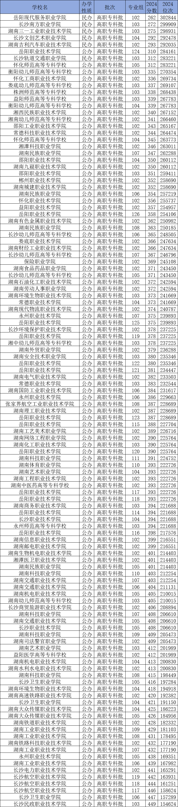 湖南专科各校最低录取分数线为:262分-449分。其中,长沙南方职业学院103组272分、299909位,湖南三一工业职业技术学院103组275分、298931位,长沙文创艺术职业学院104组292分、292478位,湖南吉利汽车职业技术学院102组293分、292035位,岳阳职业技术学院124组310分、284161位等。