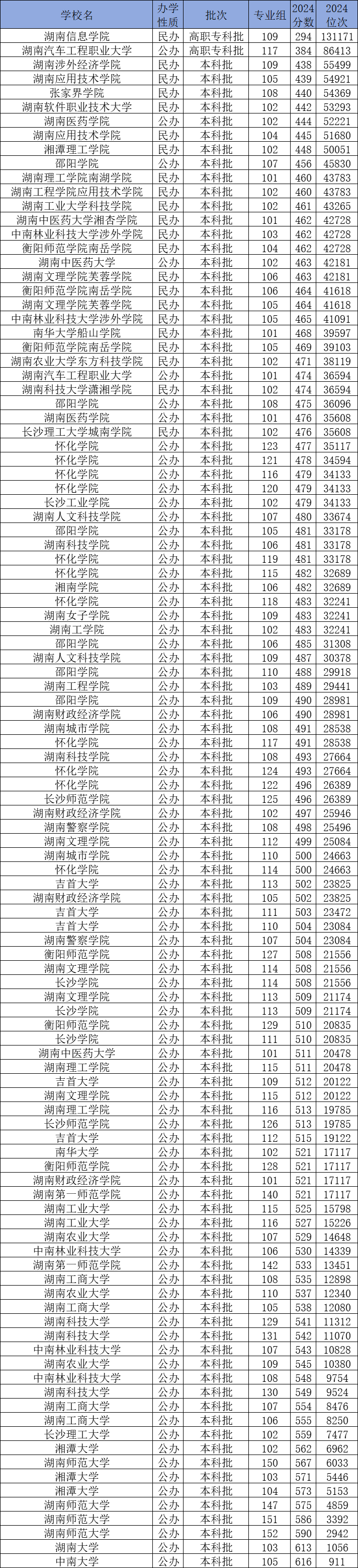 湖南本科各校最低录取分数线为:294分-616分。其中,湖南汽车工程职业大学117组384分、86413位,湖南涉外经济学院109组438分、55499位,湖南应用技术学院105组439分、54921位,张家界学院108组440分、54369位,湖南软件职业技术大学102组442分、53293位等。