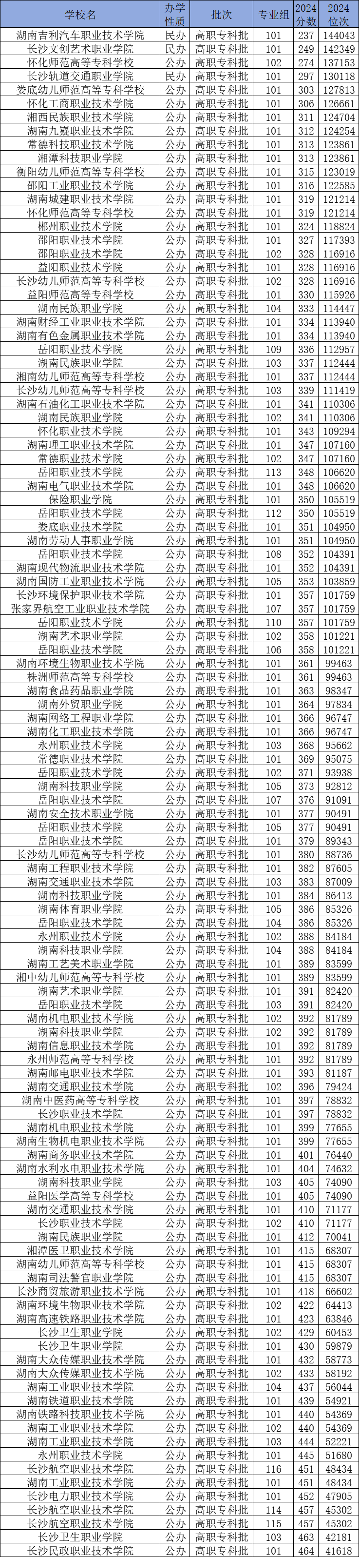 录取分数线最高、最难考的专科高校是长沙民政职业技术学院101组,2024最低分数线为464分,位次为41618名。