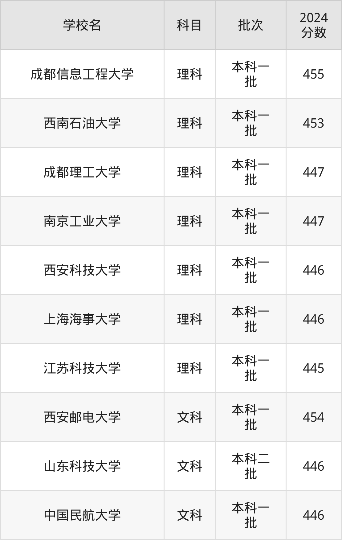 文科科目考生能上的有3所,全部在本科批次录取。具体有:西安邮电大学(454分)、山东科技大学(446分)、中国民航大学(446分)。