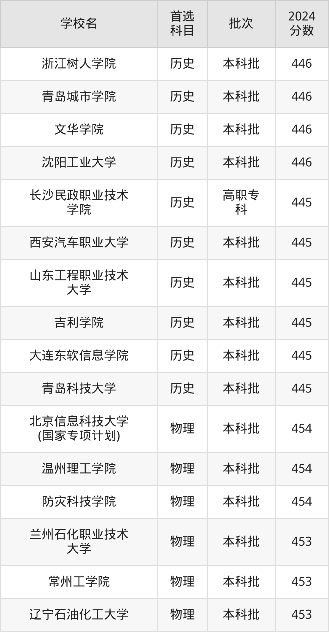 首选物理科目考生能上的有21所,全部在本科批次录取。具体有:北京信息科技大学(国家专项计划)(454分)、温州理工学院(454分)、防灾科技学院(454分)、兰州石化职业技术大学(453分)等。