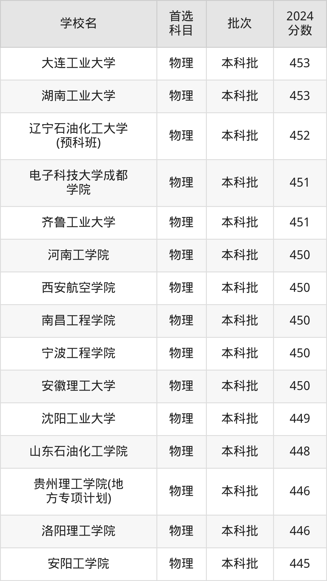 为给各位考生更加详细的参考,下文整理了2024年录取分数线在445分到455分之间的理工类大学名单汇总。