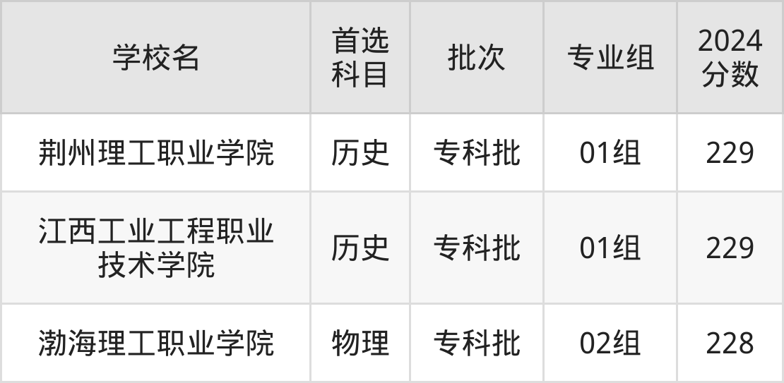 首选历史科目考生能上的有2所,全部在专科批次录取。具体有:荆州理工职业学院01组(229分)、江西工业工程职业技术学院01组(229分);