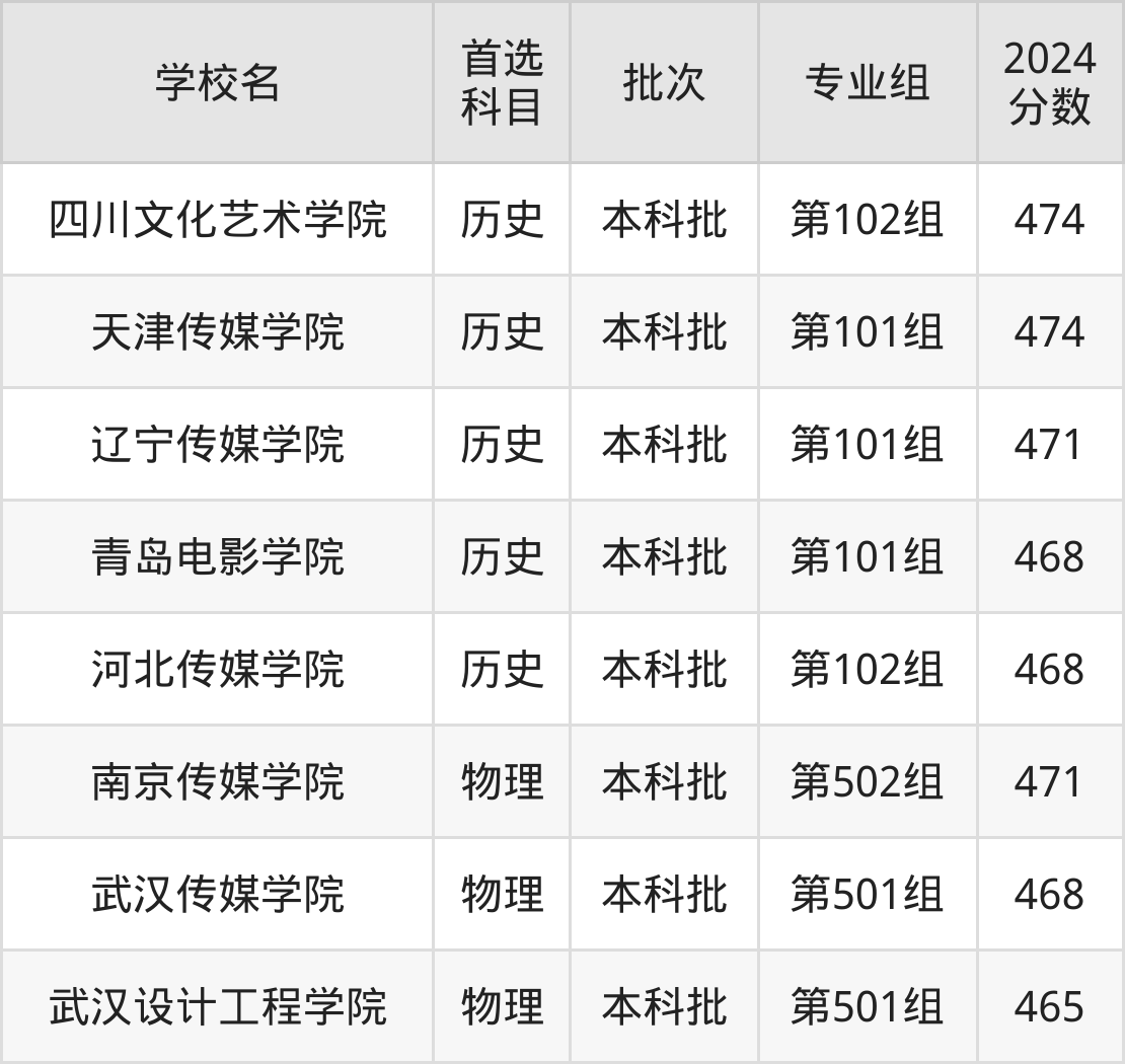 首选历史科目考生能上的有5所,全部在本科批次录取。具体有:四川文化艺术学院第102组(474分)、天津传媒学院第101组(474分)、辽宁传媒学院第101组(471分)、青岛电影学院第101组(468分)等;