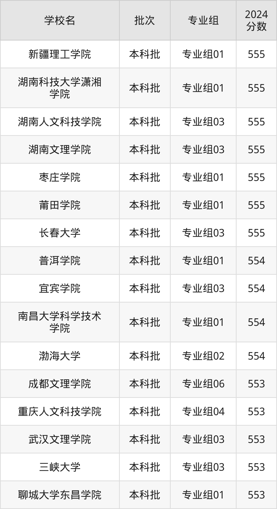 考生能上的有34所,全部在本科批次录取。具体有:新疆理工学院专业组01(555分)、湖南科技大学潇湘学院专业组01(555分)、湖南人文科技学院专业组03(555分)、湖南文理学院专业组03(555分)等。