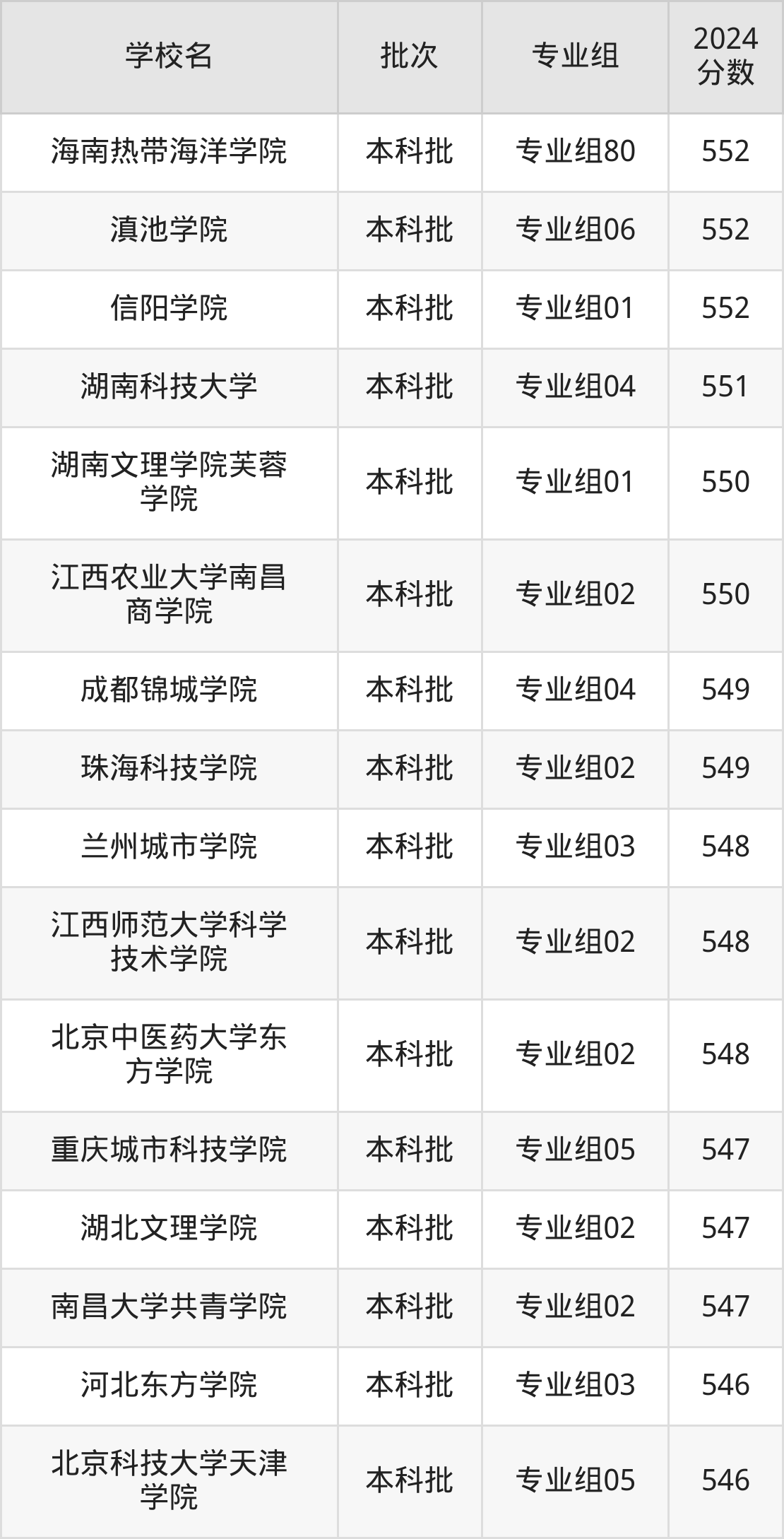 根据2024年高考招录数据,录取分数线刚好为550分的综合类大学有湖南文理学院芙蓉学院、江西农业大学南昌商学院。下面是这些学校的相关介绍: