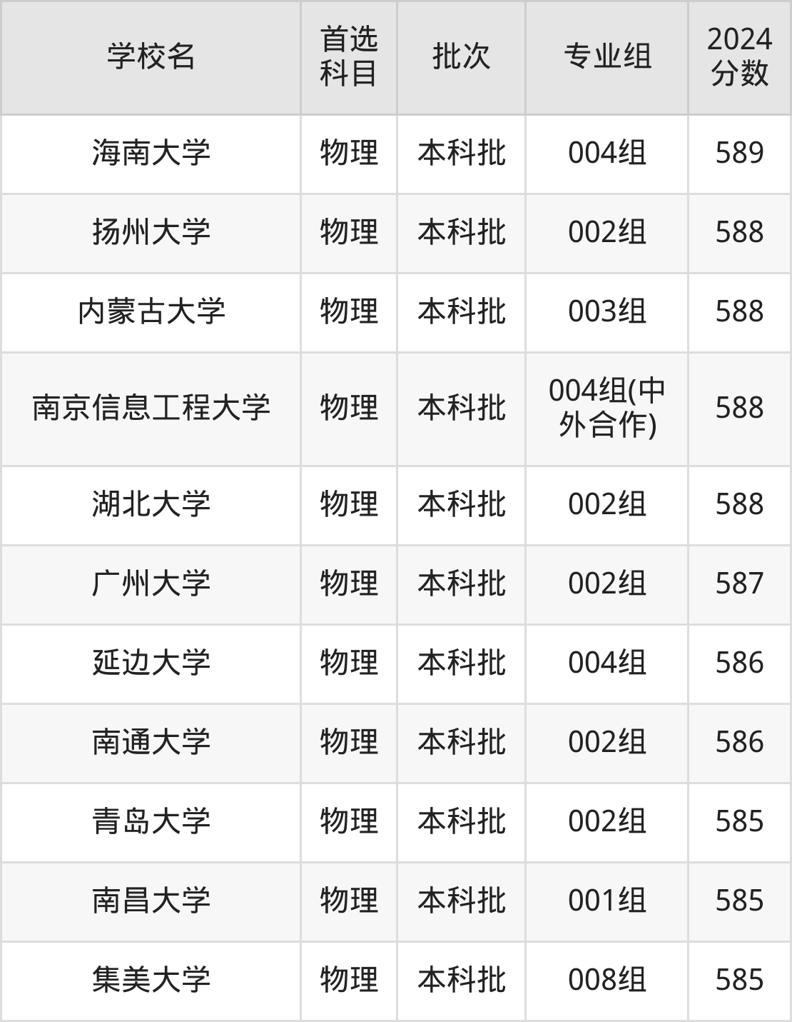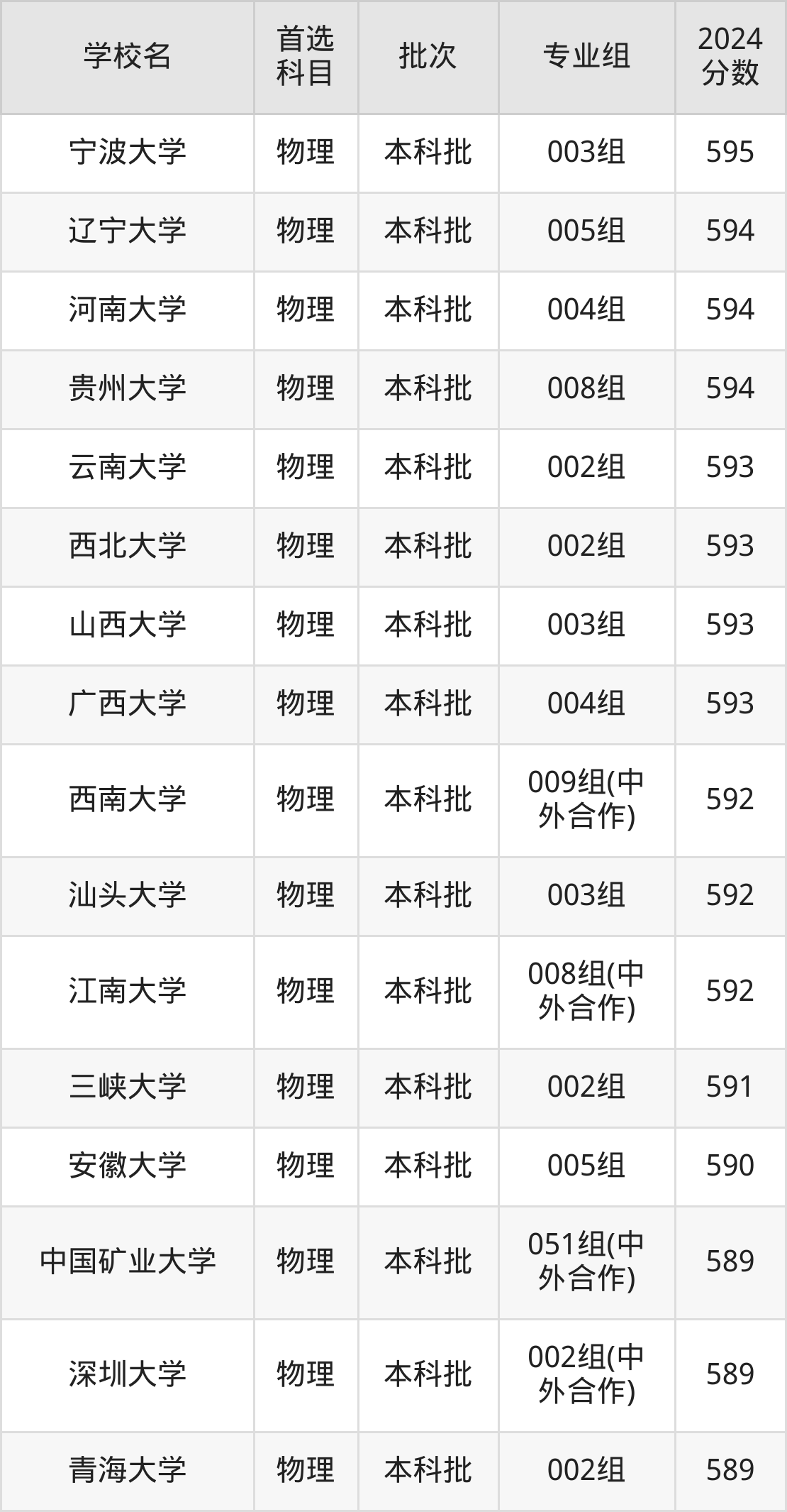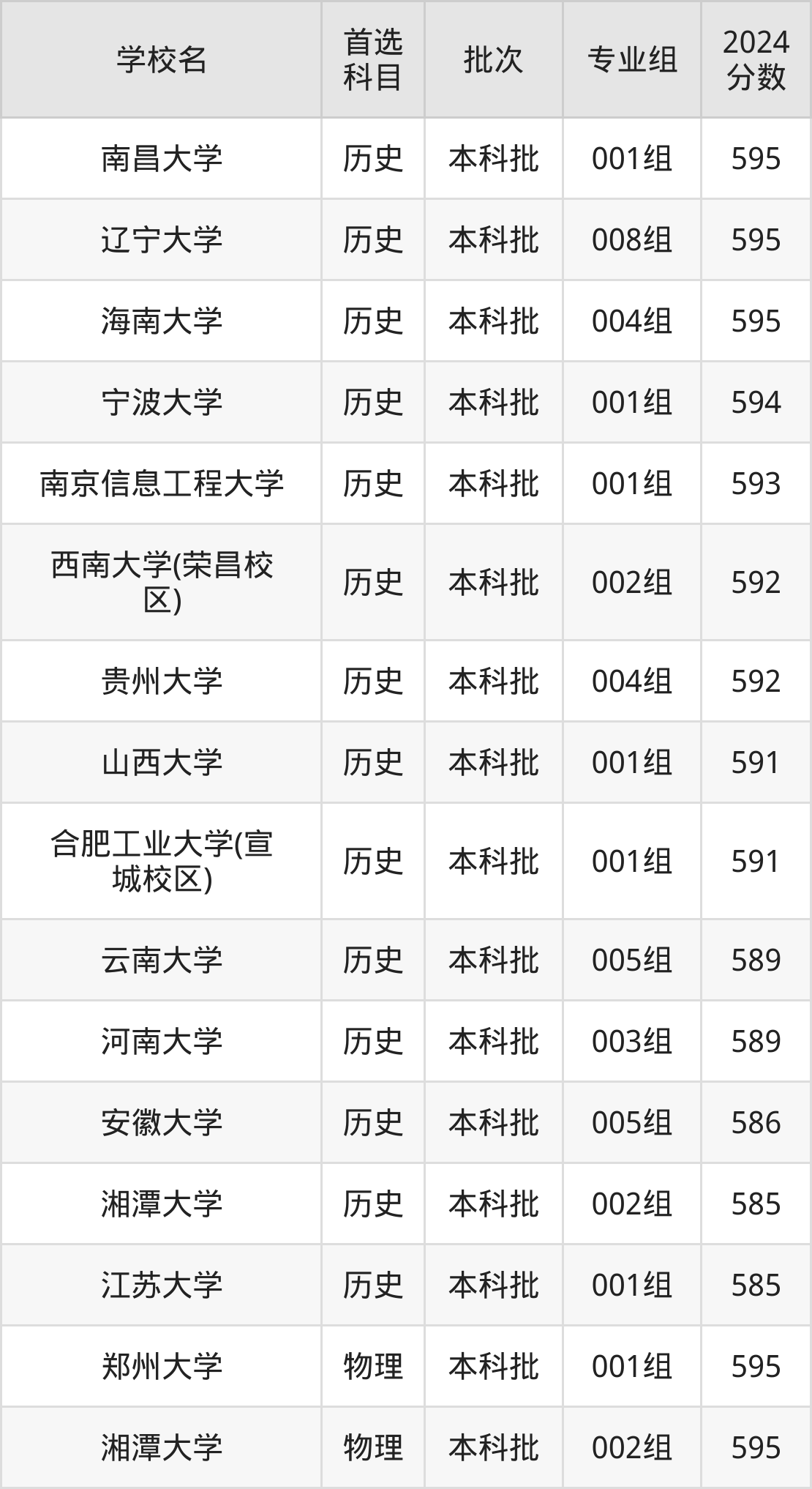 首选物理科目考生能上的有29所,全部在本科批次录取。具体有:郑州大学001组(595分)、湘潭大学002组(595分)、宁波大学003组(595分)、辽宁大学005组(594分)等。