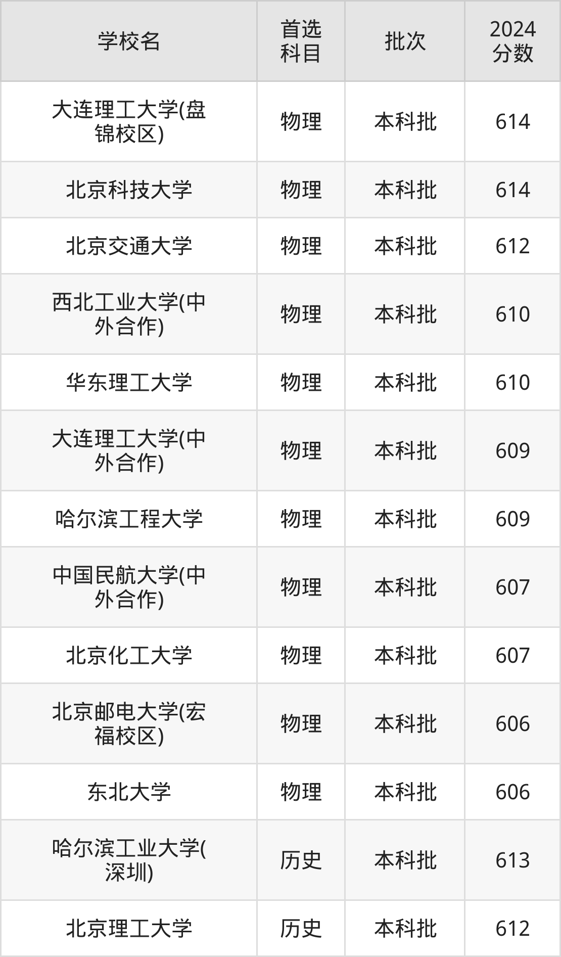首选物理科目考生能上的有11所,全部在本科批次录取。具体有:大连理工大学(盘锦校区)(614分)、北京科技大学(614分)、北京交通大学(612分)、西北工业大学(中外合作)(610分)等;