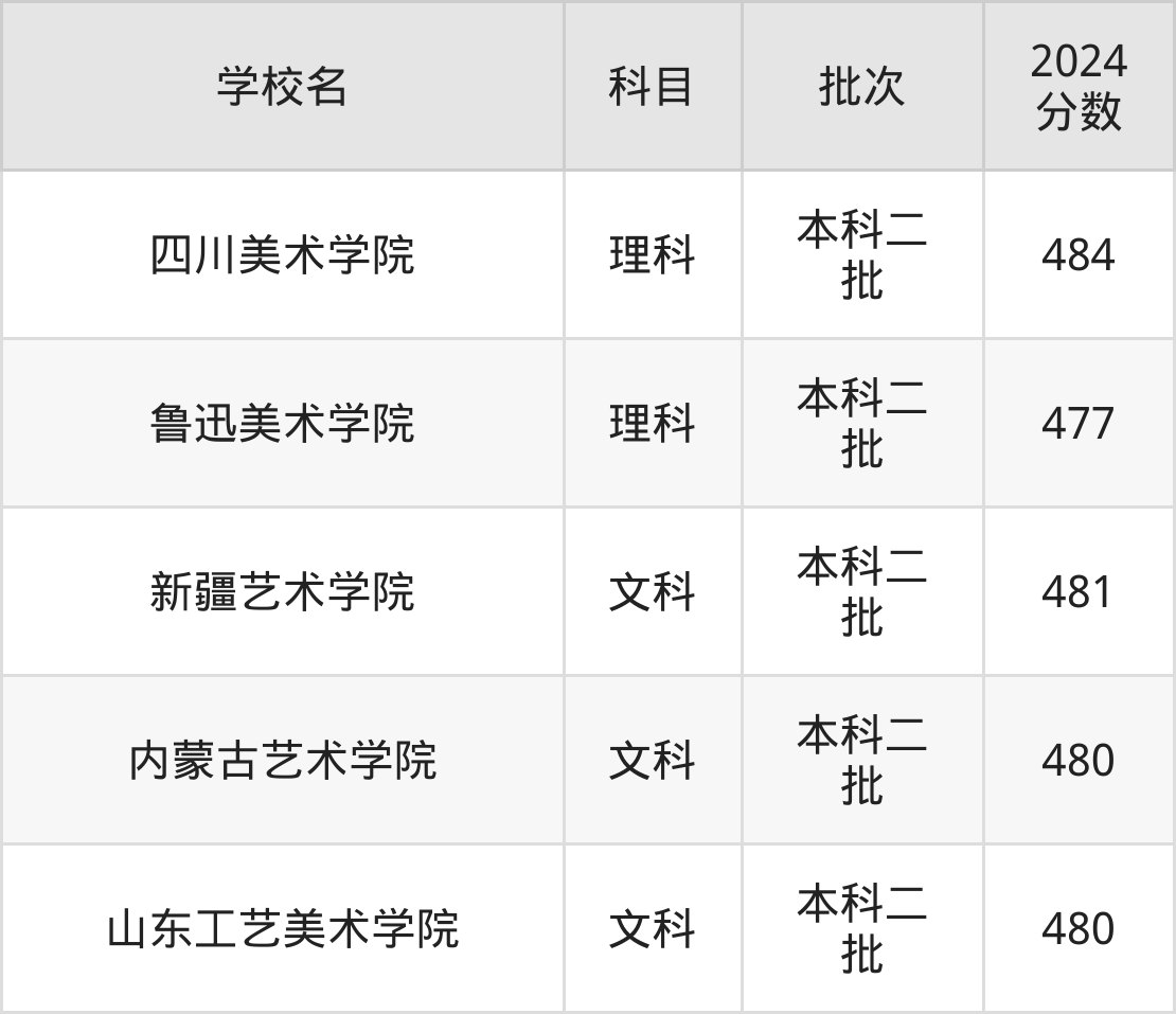 根据2024年高考招录数据,录取分数线刚好为480分的艺术类大学有内蒙古艺术学院、山东工艺美术学院。下面是这些学校的相关介绍: