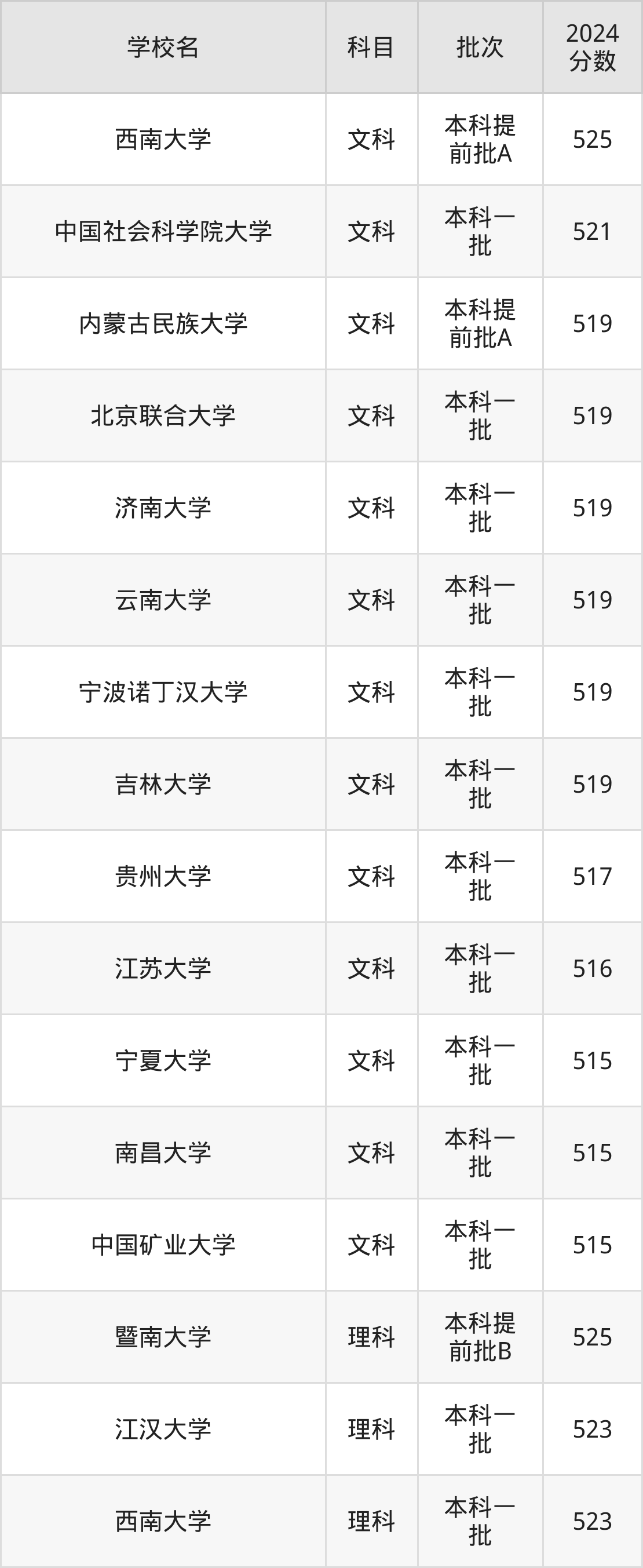 为给各位考生更加详细的参考,下文整理了2024年录取分数线在515分到525分之间的综合类大学名单汇总。