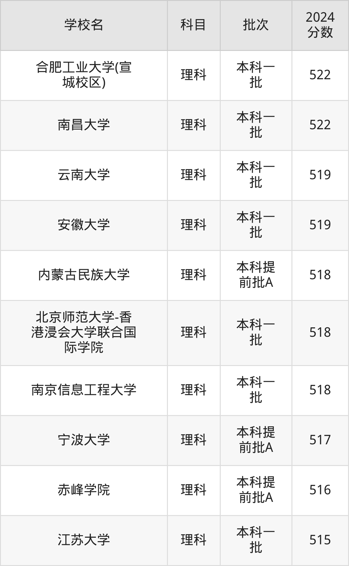 理科科目考生能上的有13所,全部在本科批次录取。具体有:暨南大学(525分)、江汉大学(523分)、西南大学(523分)、合肥工业大学(宣城校区)(522分)等。