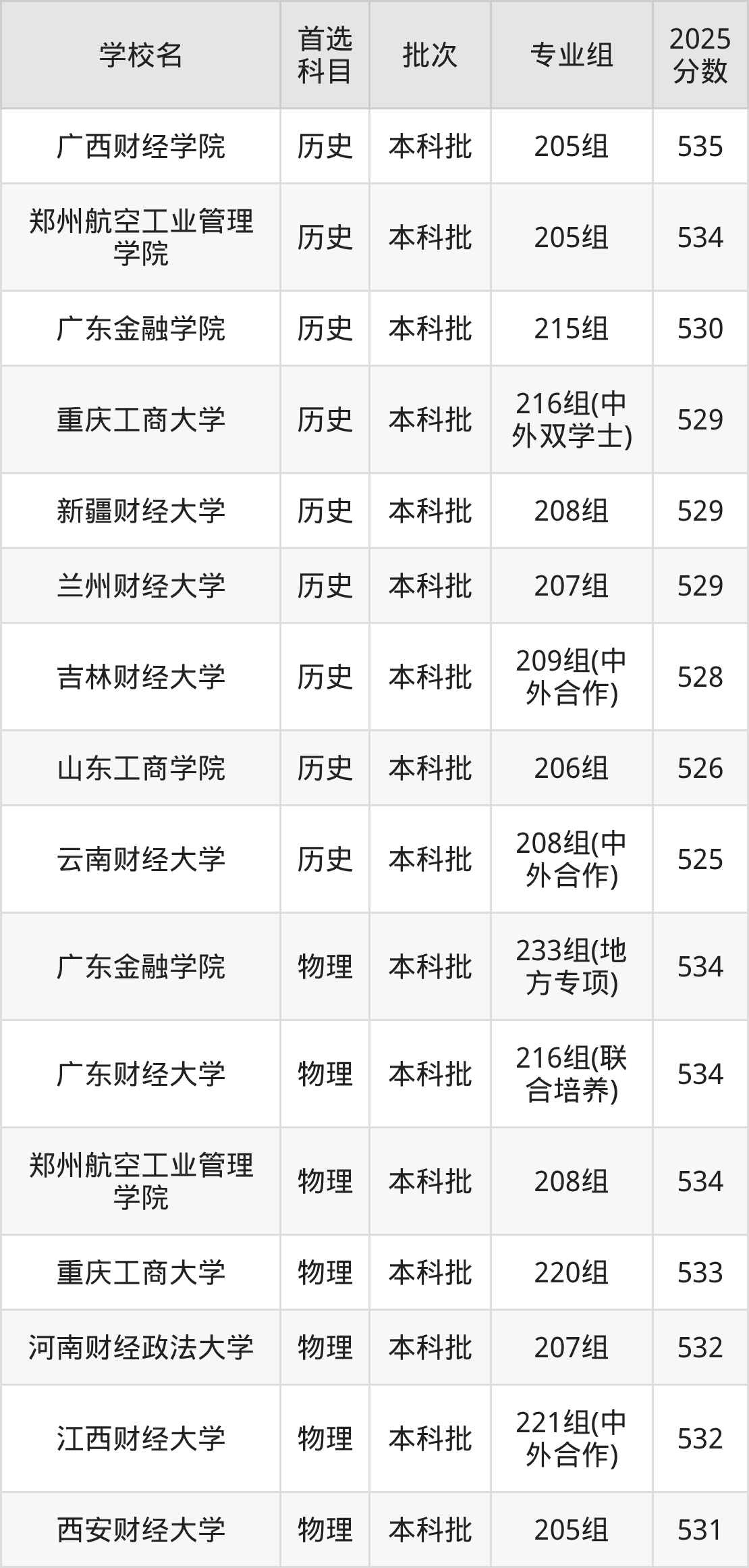 首选历史科目考生能上的有9所,全部在本科批次录取。具体有:广西财经学院205组(535分)、郑州航空工业管理学院205组(534分)、广东金融学院215组(530分)、重庆工商大学216组(中外双学士)(529分)等;