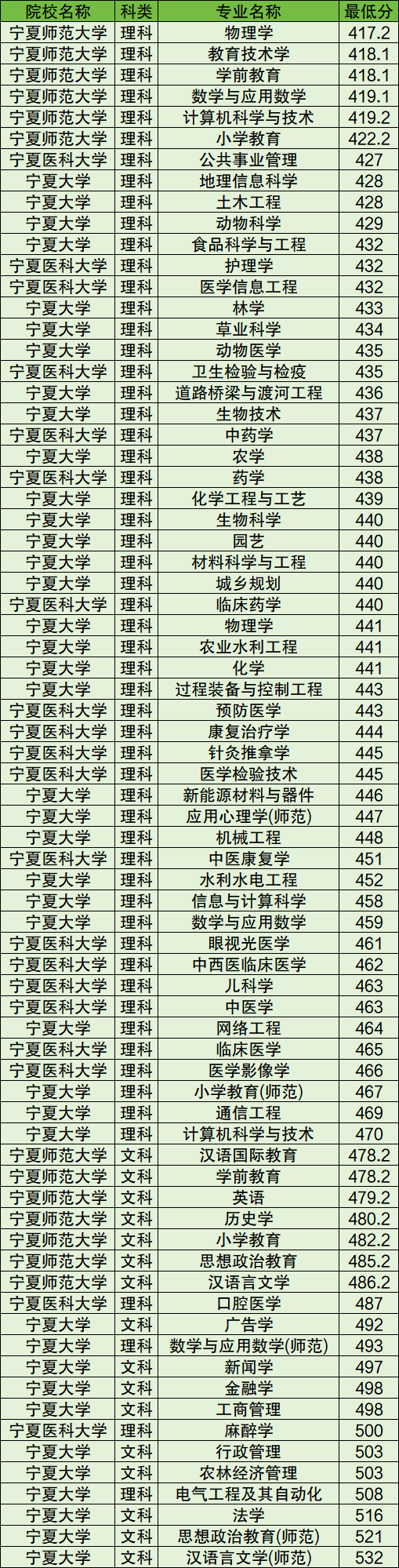 宁夏大学:地理信息科学428分、动物科学429分、食品科学与工程432分、林学433分、草业科学434分、动物医学435分、道路桥梁与渡河工程436分、生物技术437分、农学438分、化学工程与工艺439分、生物科学440分、物理学441分、过程装备与控制工程443分、新能源材料与器件446分、应用心理学(师范)447分、机械工程448分、水利水电工程452分、信息与计算科学458分、数学与应用数学459分、网络工程464分、小学教育(师范)467分、通信工程469分、计算机科学与技术470分、数学与应用数学(师范)493分、电气工程及其自动化508分;
