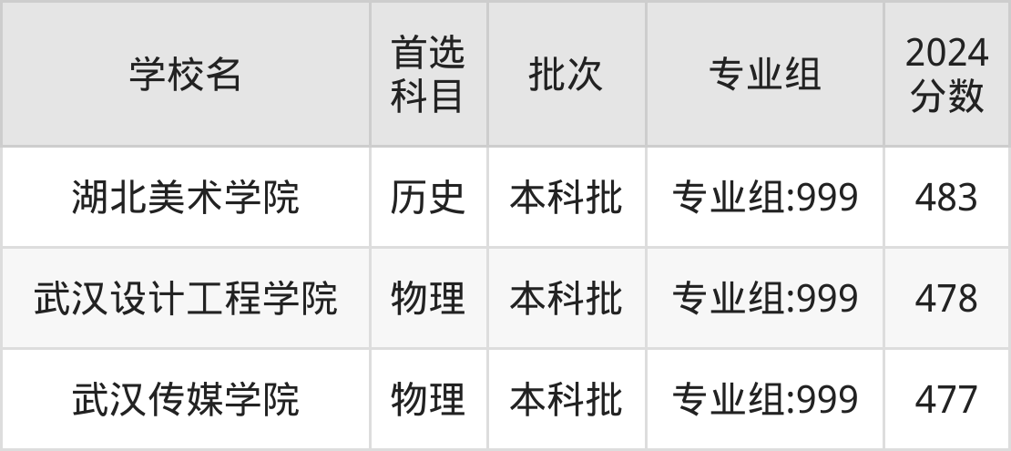 首选物理科目考生能上的有2所,全部在本科批次录取。具体有:武汉设计工程学院专业组:999(478分)、武汉传媒学院专业组:999(477分)。