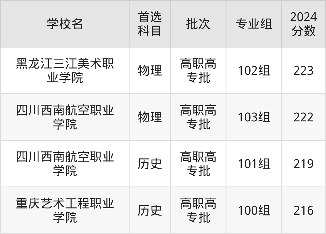 首选物理科目考生能上的有2所,全部在专科批次录取。具体有:黑龙江三江美术职业学院102组(223分)、四川西南航空职业学院103组(222分);