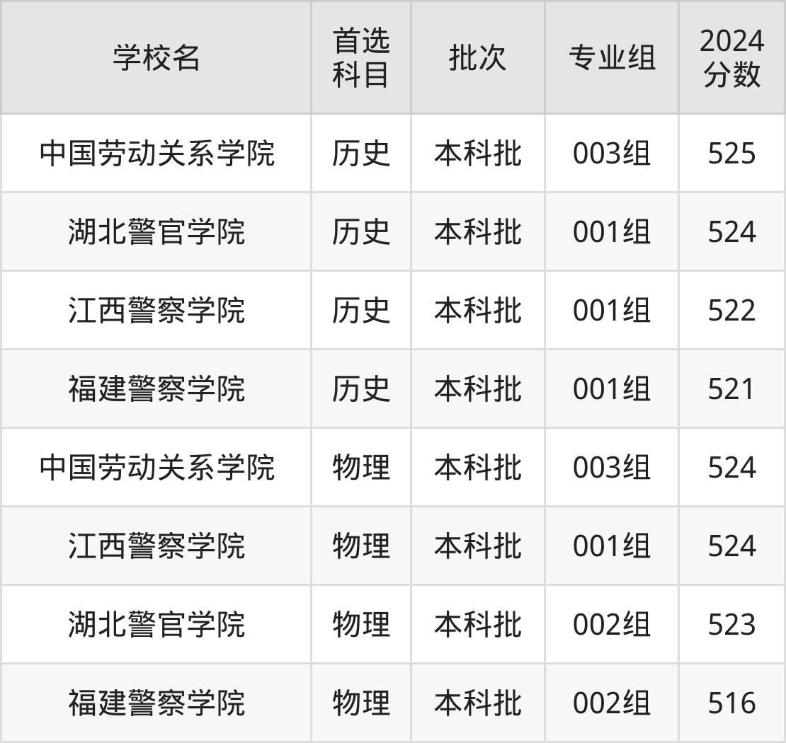 首选历史科目考生能上的有4所,全部在本科批次录取。具体有:中国劳动关系学院003组(525分)、湖北警官学院001组(524分)、江西警察学院001组(522分)、福建警察学院001组(521分)等;