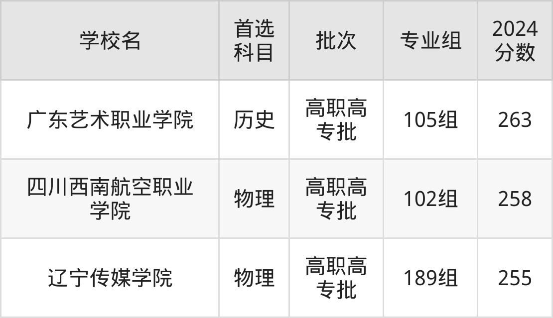 首选历史科目考生能上的有1所,全部在专科批次录取。具体有:广东艺术职业学院105组(263分);