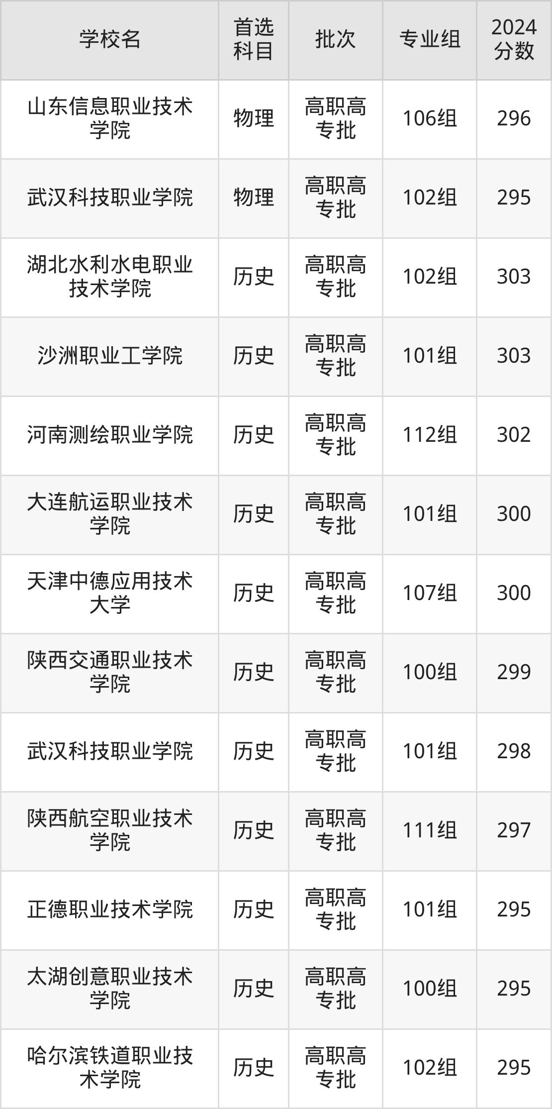 首选历史科目考生能上的有11所,包括1所本科医科大学和10所专科医科大学。具体有:湖北水利水电职业技术学院102组(303分)、沙洲职业工学院101组(303分)、河南测绘职业学院112组(302分)、大连航运职业技术学院101组(300分)等。