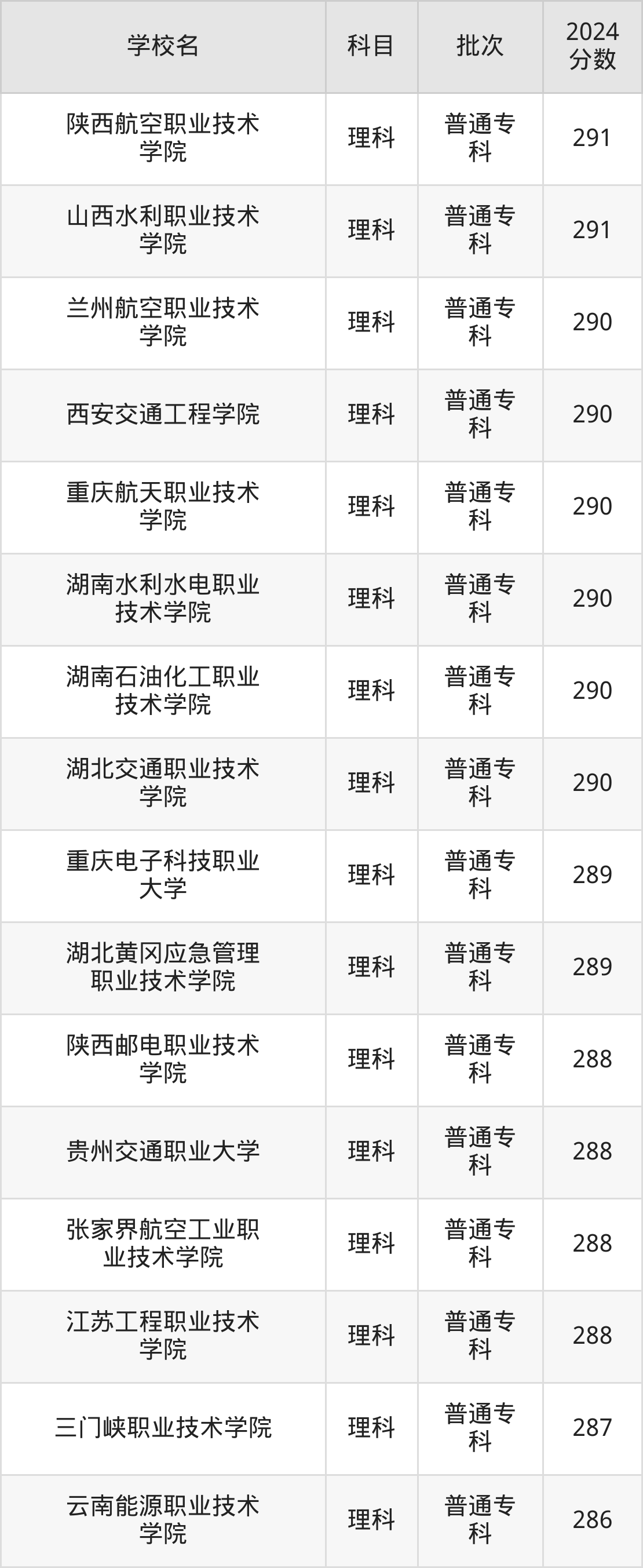 根据2024年高考招录数据,录取分数线刚好为290分的理工类大学有兰州航空职业技术学院、西安交通工程学院、重庆航天职业技术学院。下面是这些学校的相关介绍: