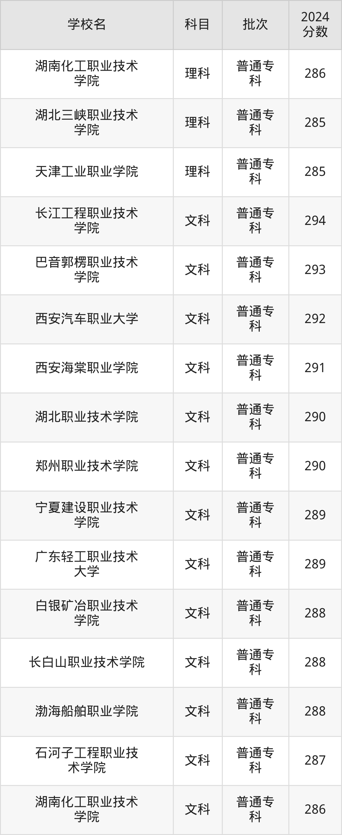 文科科目考生能上的有14所,包括2所本科医科大学和12所专科医科大学。具体有:长江工程职业技术学院(294分)、巴音郭楞职业技术学院(293分)、西安汽车职业大学(292分)、西安海棠职业学院(291分)等。