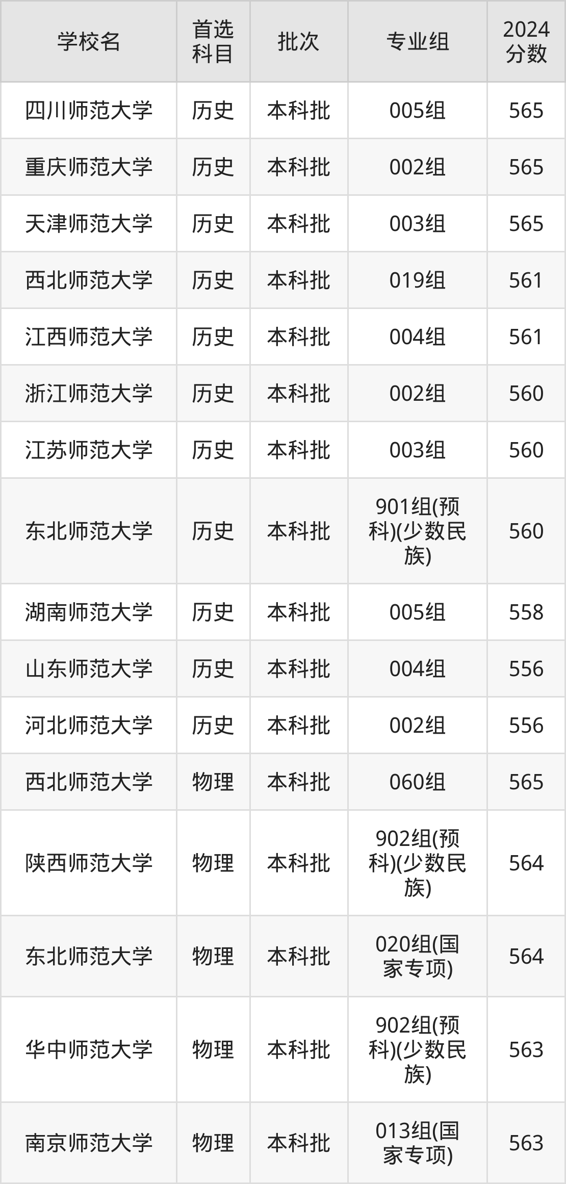 首选历史科目考生能上的有11所,全部在本科批次录取。具体有:四川师范大学005组(565分)、重庆师范大学002组(565分)、天津师范大学003组(565分)、西北师范大学019组(561分)等;