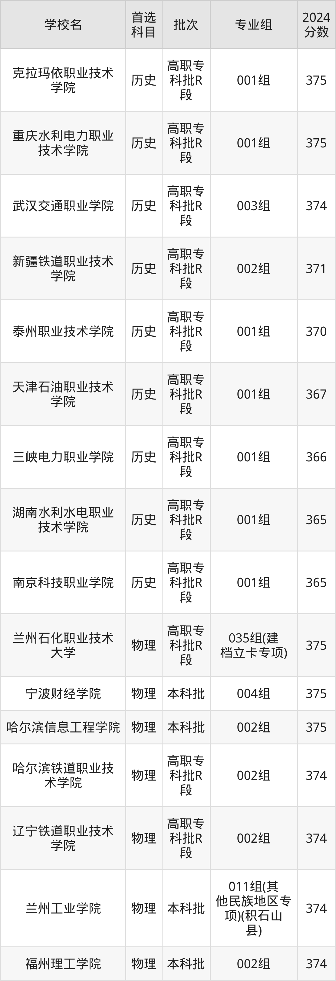 首选历史科目考生能上的有9所,全部在专科批次录取。具体有:克拉玛依职业技术学院001组(375分)、重庆水利电力职业技术学院001组(375分)、武汉交通职业学院003组(374分)、新疆铁道职业技术学院002组(371分)等;