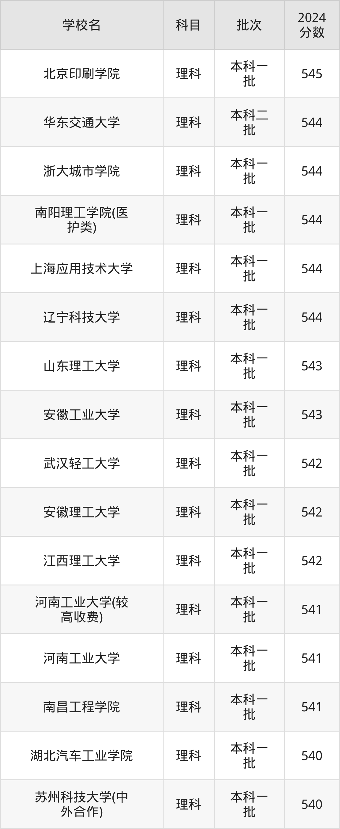 理科科目考生能上的有25所,全部在本科批次录取。具体有:北京印刷学院(545分)、华东交通大学(544分)、浙大城市学院(544分)、南阳理工学院(医护类)(544分)等;
