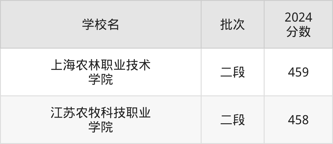 考生能上的有2所,全部在专科批次录取。具体有:上海农林职业技术学院(459分)、江苏农牧科技职业学院(458分)。