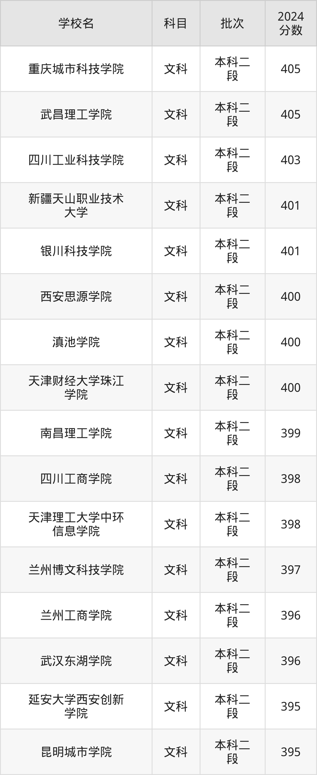 文科科目考生能上的有18所,全部在本科批次录取。具体有:重庆城市科技学院(405分)、武昌理工学院(405分)、四川工业科技学院(403分)、新疆天山职业技术大学(401分)等;