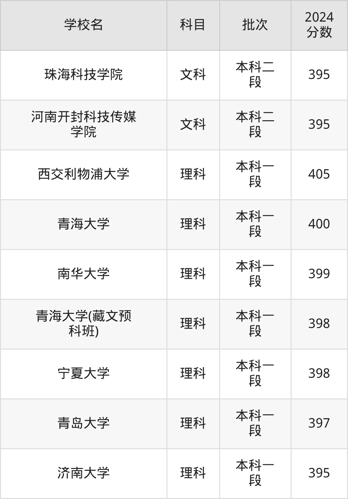 理科科目考生能上的有7所,全部在本科批次录取。具体有:西交利物浦大学(405分)、青海大学(400分)、南华大学(399分)、青海大学(藏文预科班)(398分)等。
